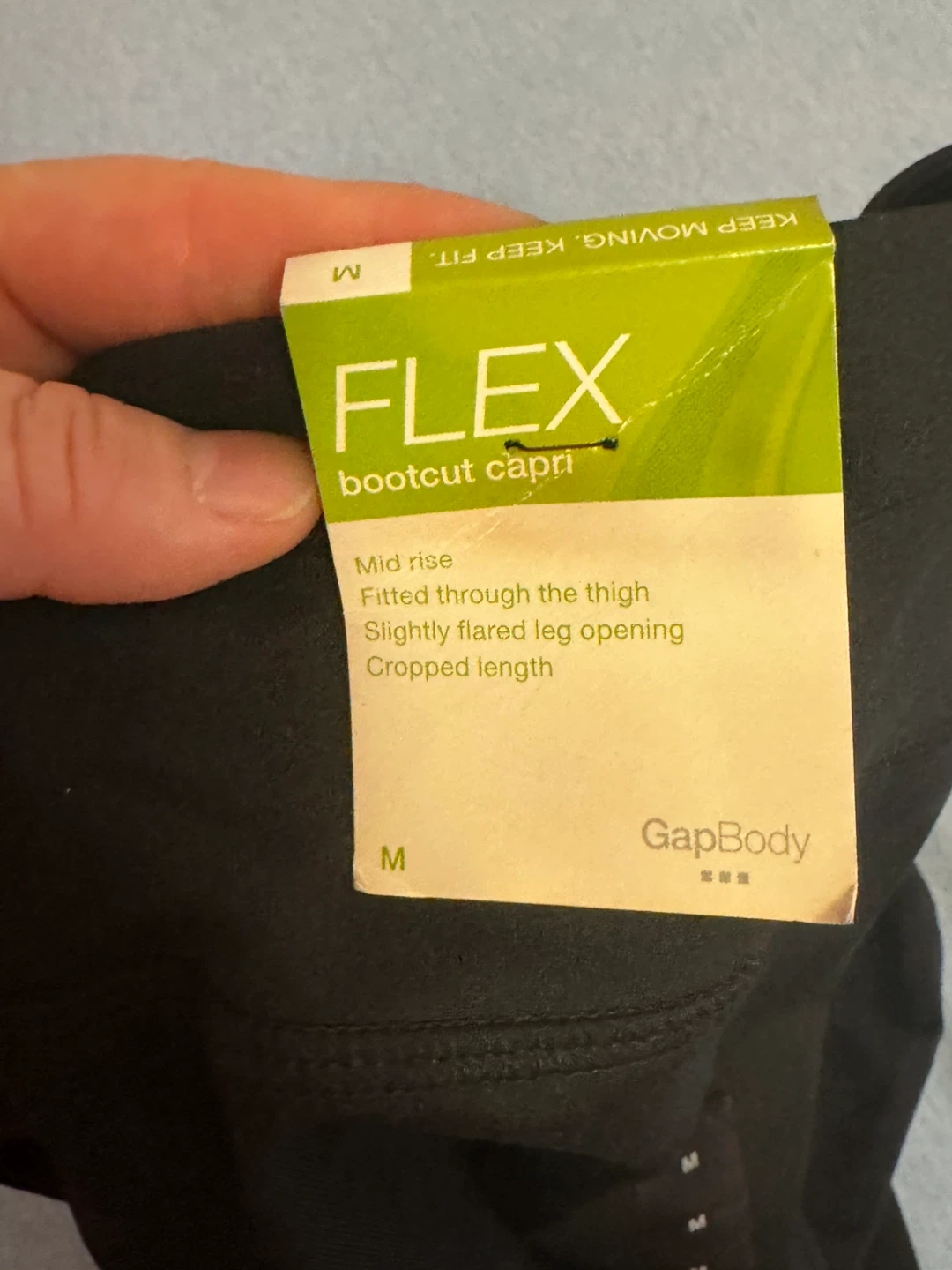 I'm selling a brand new with tags GapBody Flex bootcut capri in size medium! These are a mid-rise style, fitted through the thigh, with a slightly flared leg opening and cropped length