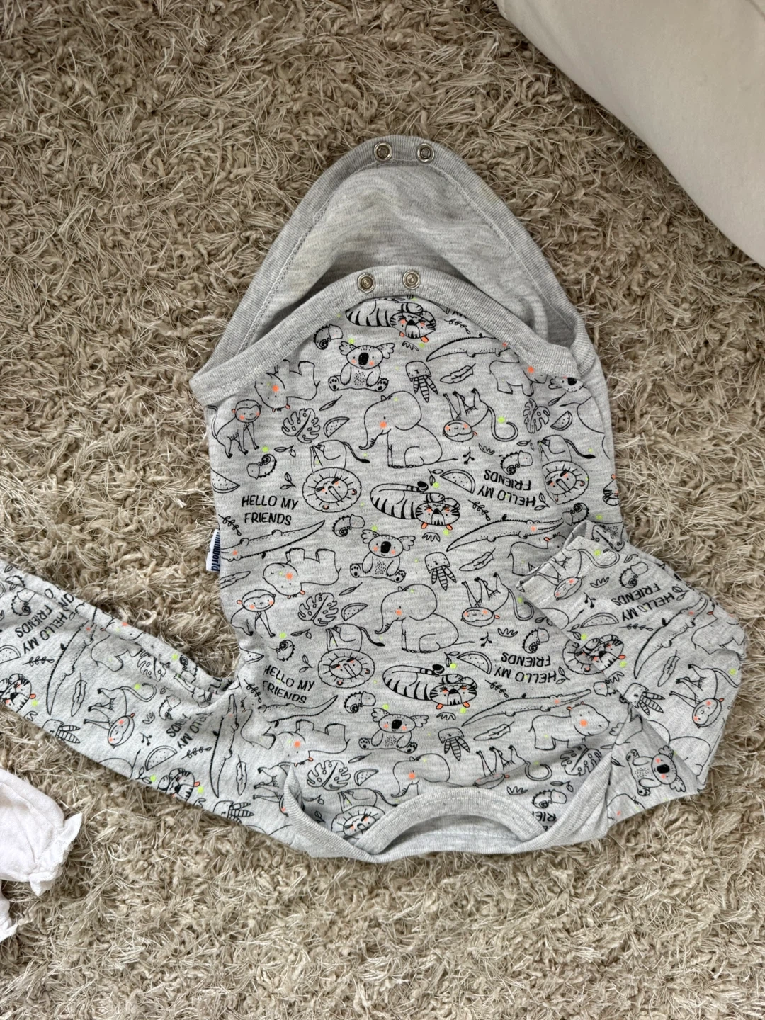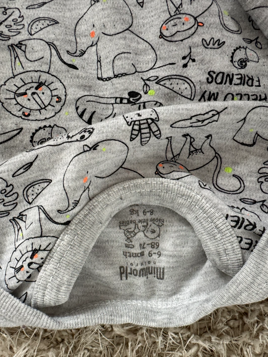 Grey long-sleeved bodysuit with an all-over animal print. Features a snap closure at the bottom and a fold-over neck. Size is 6-9 months.