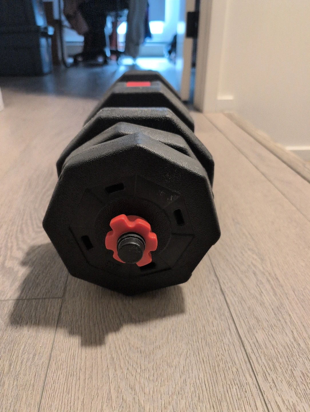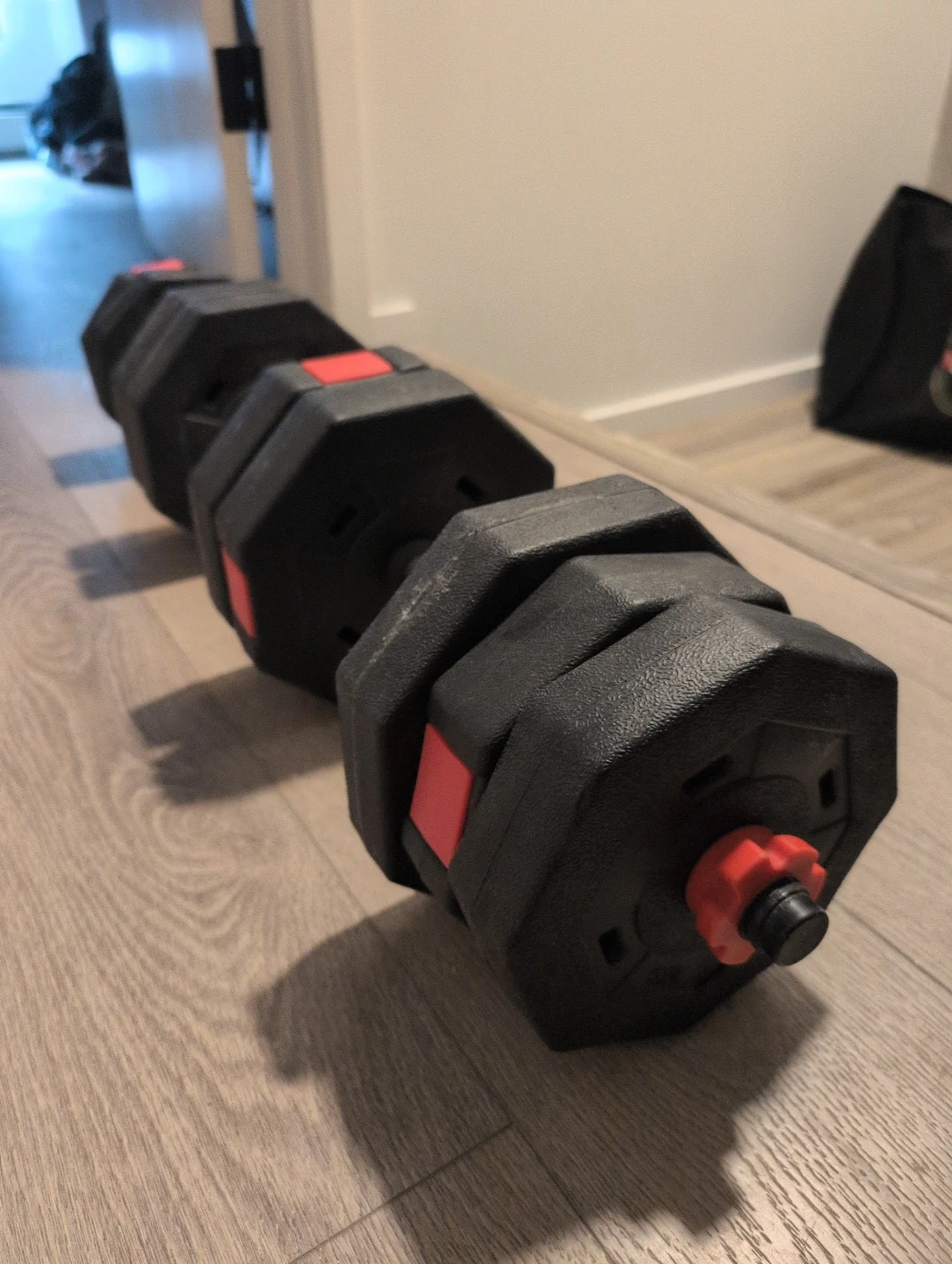 Black adjustable dumbbell set with red accents. Weights can be added or removed for customizable resistance. Great for home workouts!