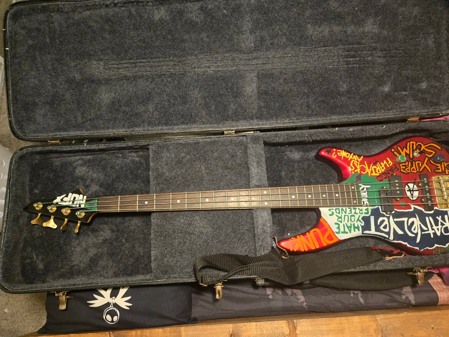This is a H.U.F. bass guitar with a custom punk art design. It's in a hard case and includes a strap. The fretboard is smooth and the hardware is gold-toned.