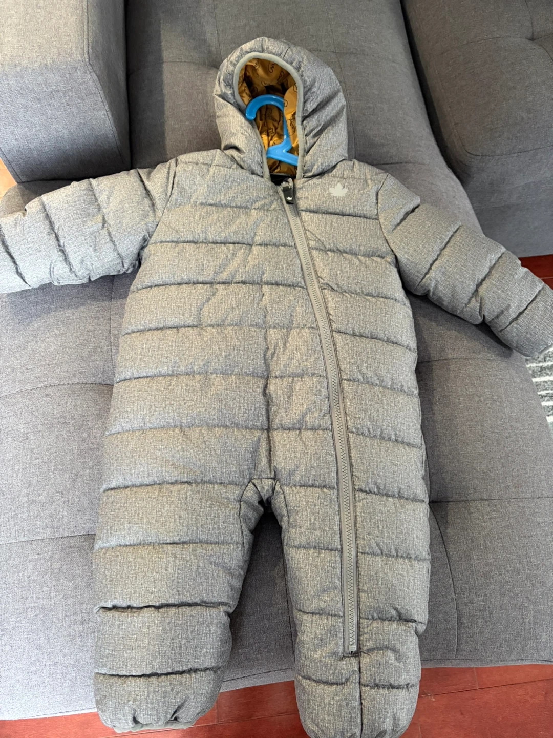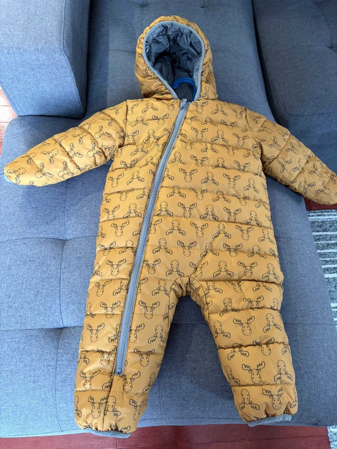 2 sided Cozy yellow snowsuit with a cute moose print, perfect for keeping your little one warm this winter. It's insulated for cold weather. The grey side features a quilted pattern and a small embroidered logo.