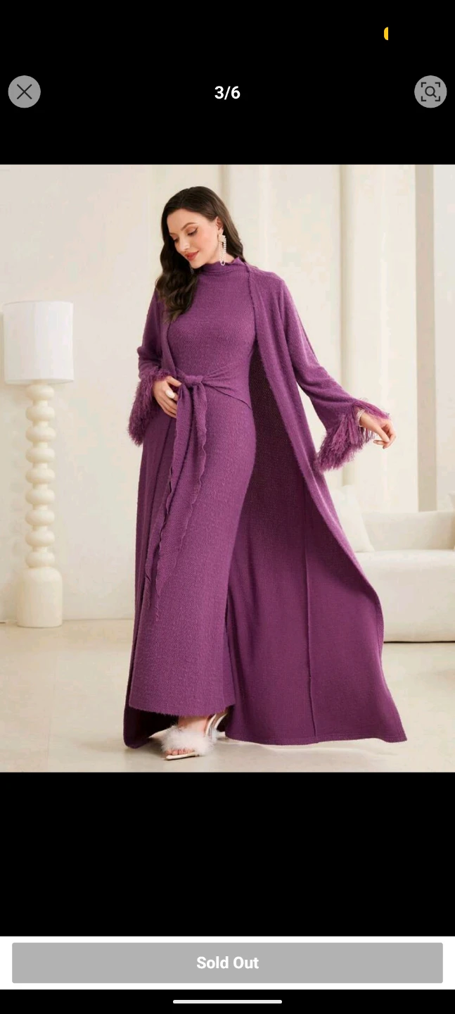 This includes a long purple knit dress long-sleeved cardigan. The cardigan features decorative feather trim on the cuffs for a touch of flair. It's made from a textured knit material. It's a stylish option to throw on for an evening out or special occasion!