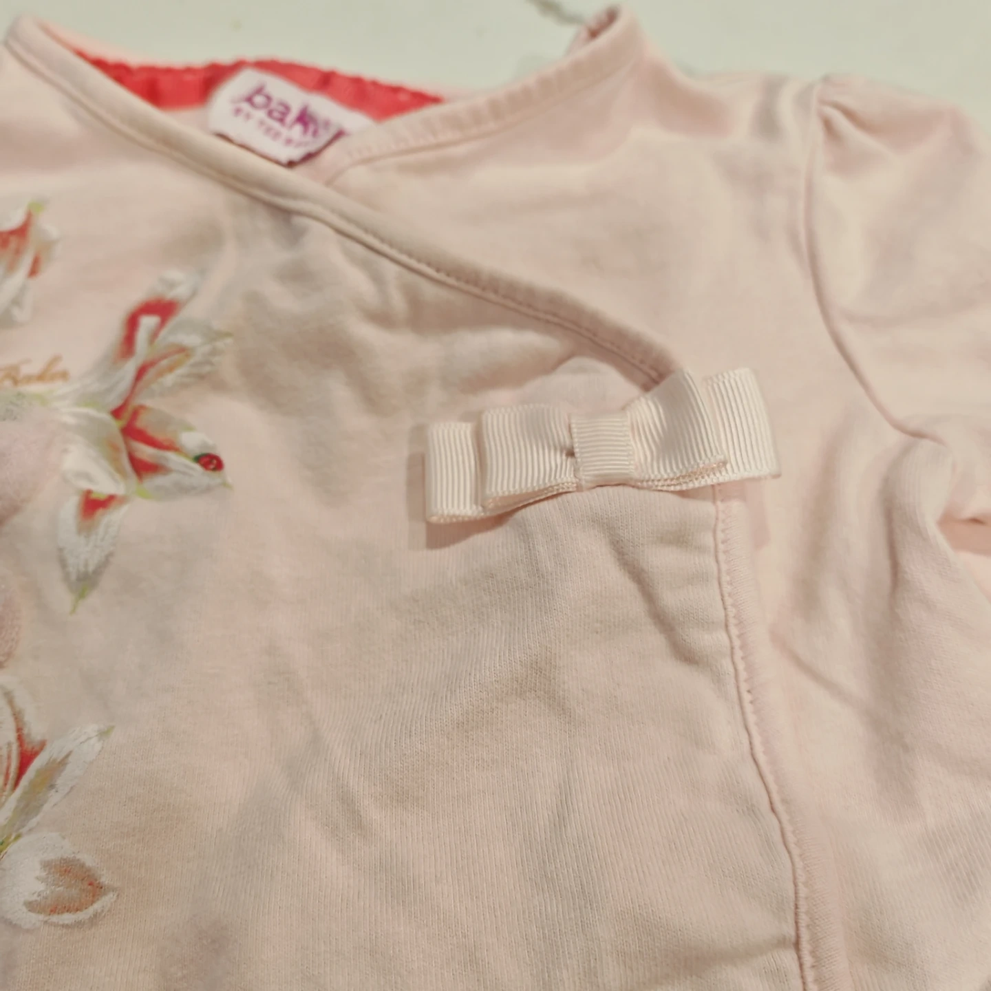 This adorable Baker by Ted Baker baby girl romper features a pink floral print with delicate ruffles and a sweet bow detail. It's a wrap-style top with snaps at the bottom for easy changes. Made from soft cotton for comfort.