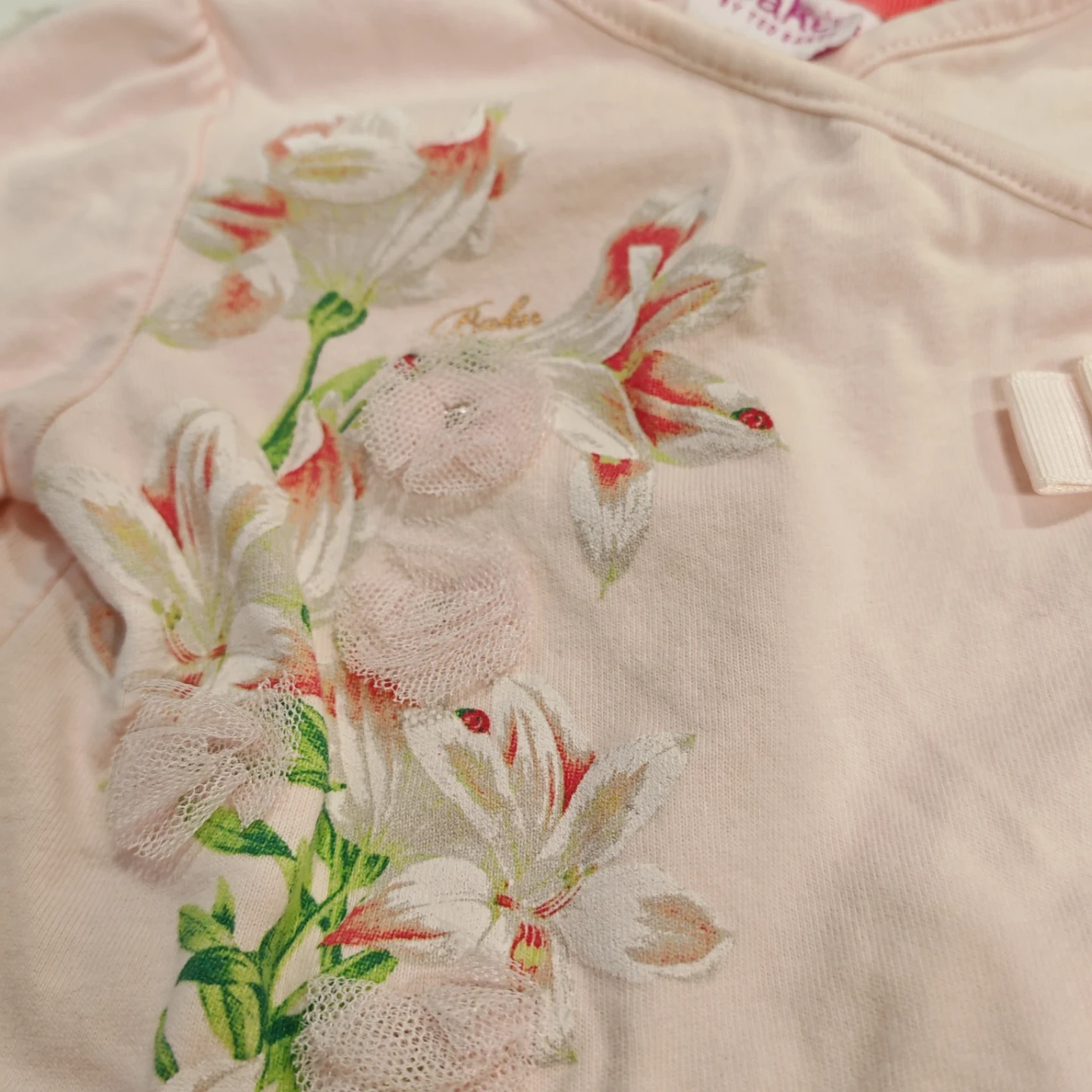 This adorable Baker by Ted Baker baby girl romper features a pink floral print with delicate ruffles and a sweet bow detail. It's a wrap-style top with snaps at the bottom for easy changes. Made from soft cotton for comfort.