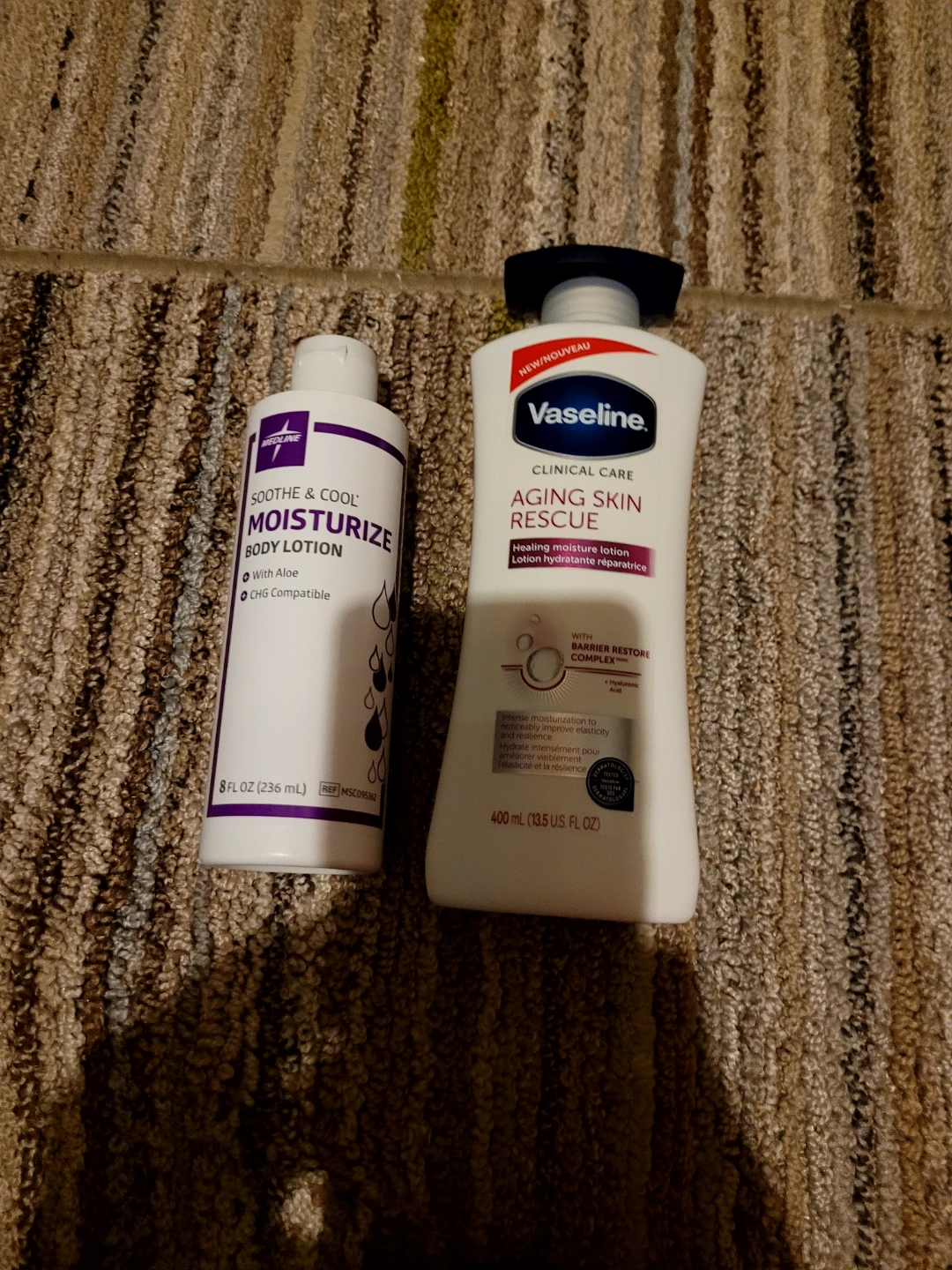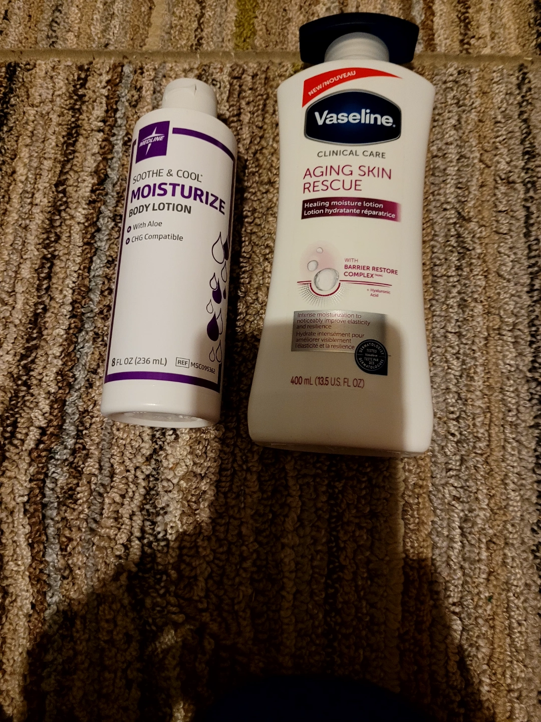 Two body lotions. One is Vaseline Clinical Care Aging Skin Rescue lotion, 400ml. The other is Moisturize body lotion, 8 fl oz. Both appear unopened.