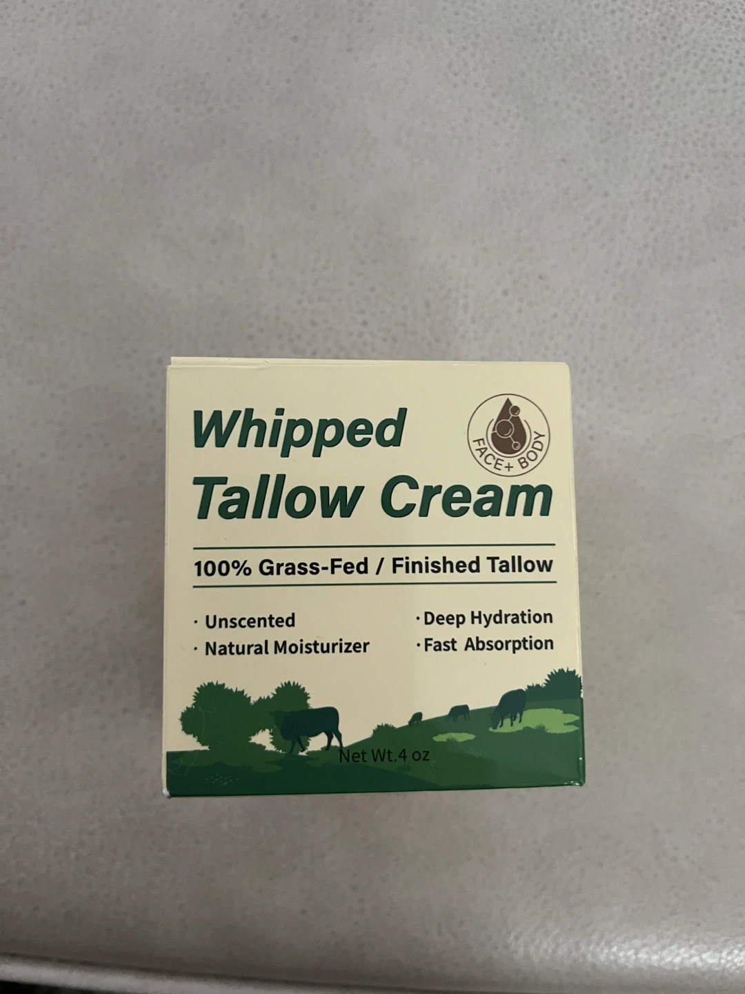 This whipped tallow cream is made with 100% grass-fed and finished tallow. It offers deep hydration and fast absorption for your face and body. Unscented formula. Net Wt. 4 oz. Expiration 14/05/2028
