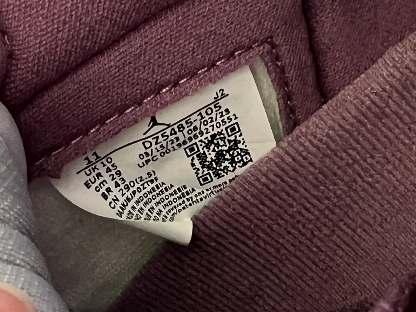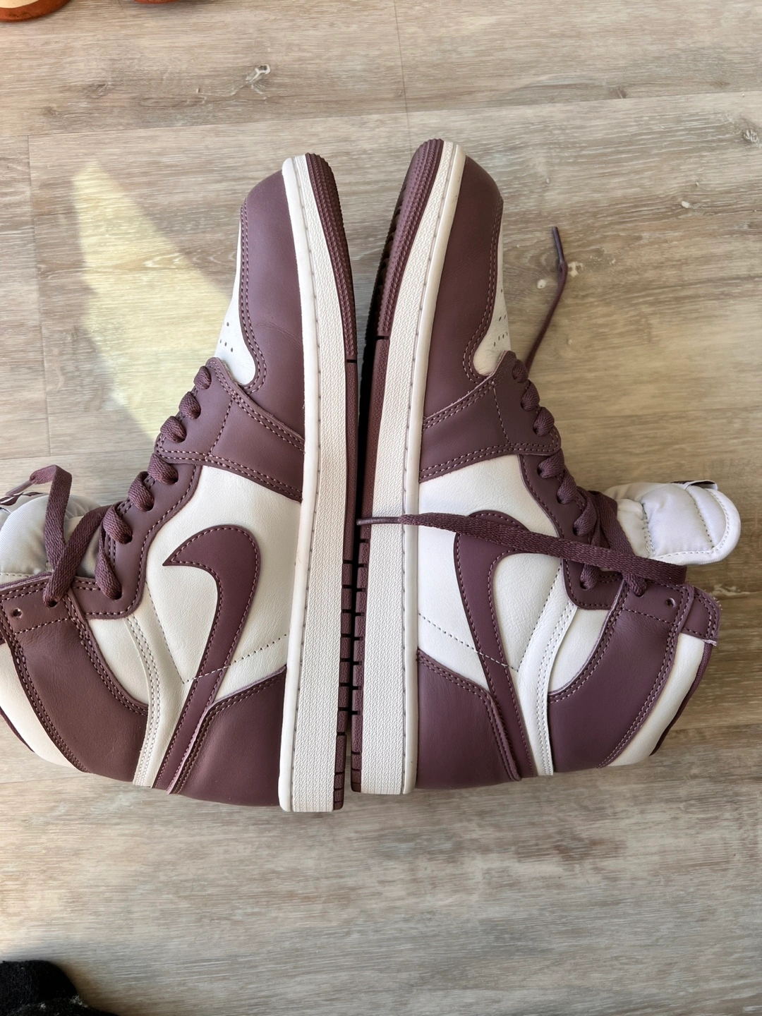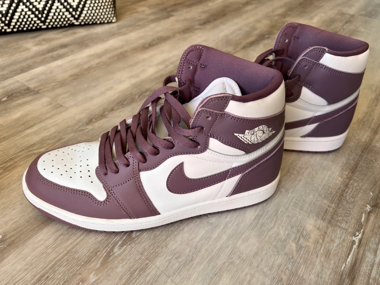 Size US 11, purple and white leather high-top sneakers. Classic Air Jordan design.