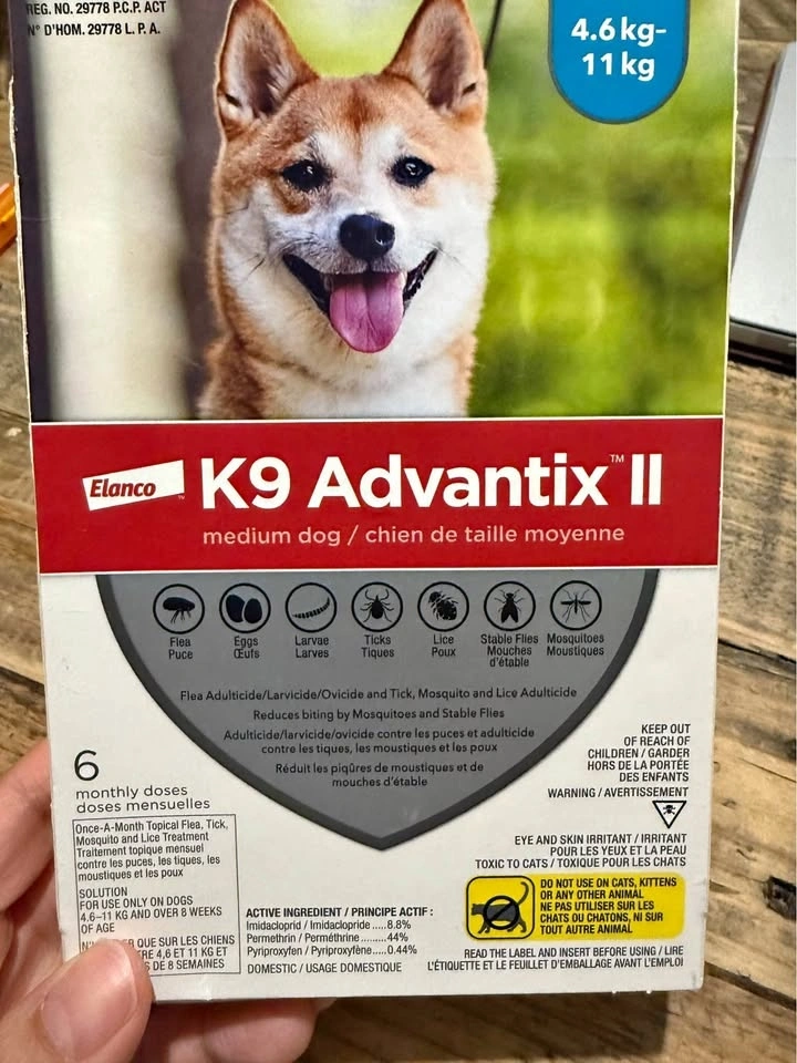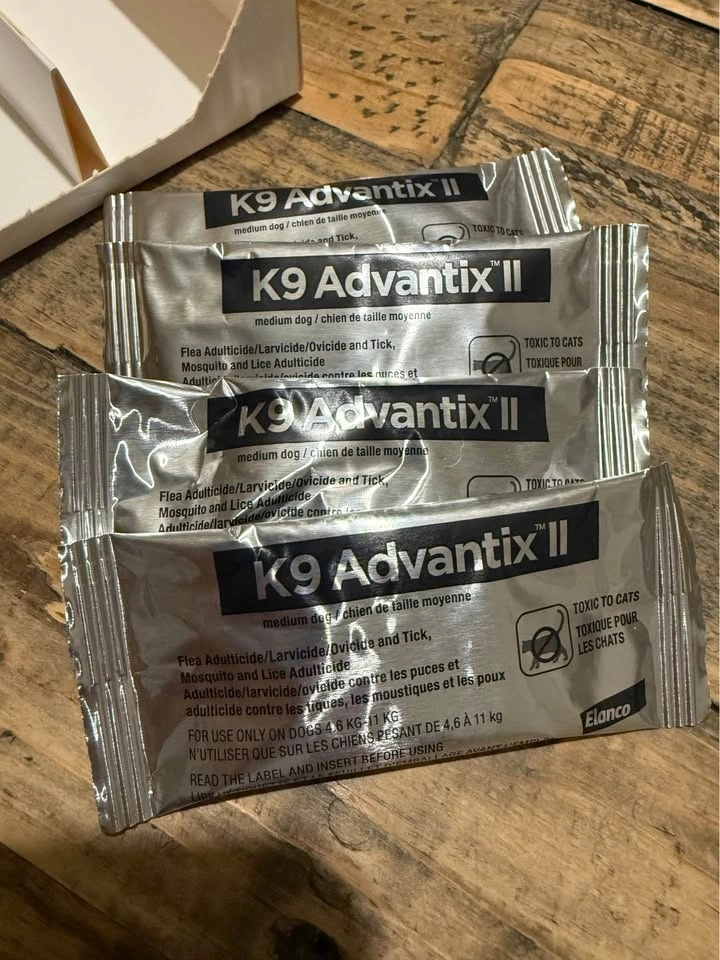 Hi there, I have 4 sealed monthly doses of K9 Advantix II flea and tick treatment for medium dogs (4.6-11 kg). I originally bought a 6-pack, but sadly my dog recently passed away, so we no longer need these.