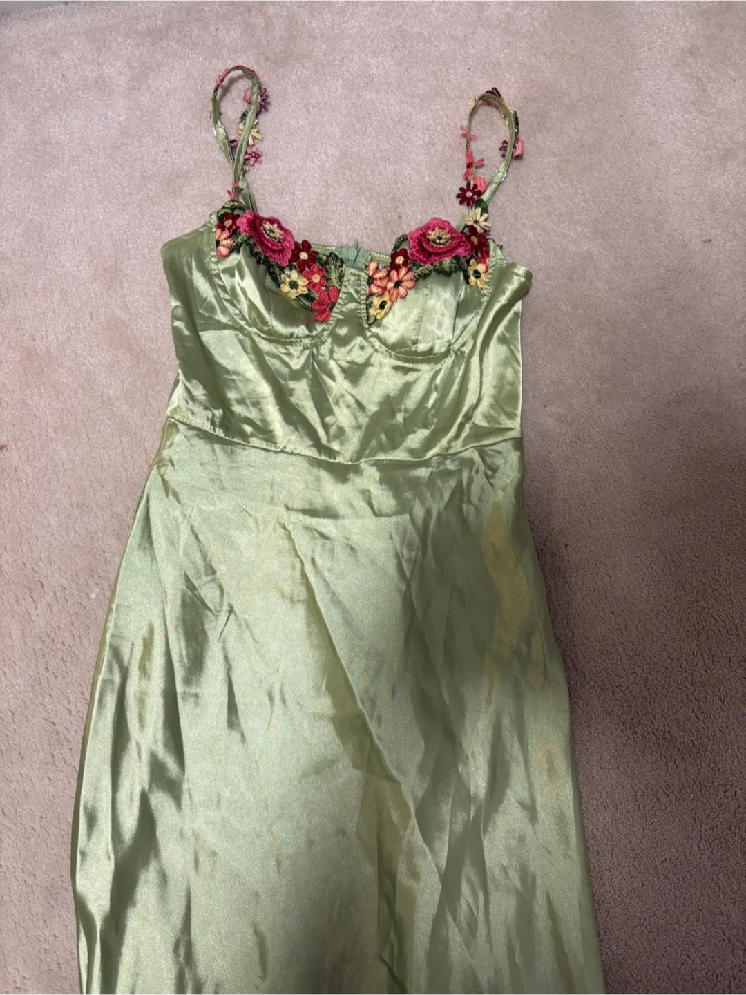 This slip dress is a light green satin with delicate floral embroidery on the bust and straps. It's a lovely piece for a special occasion. Satin material.