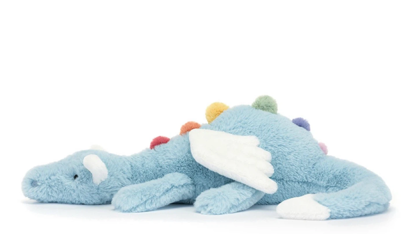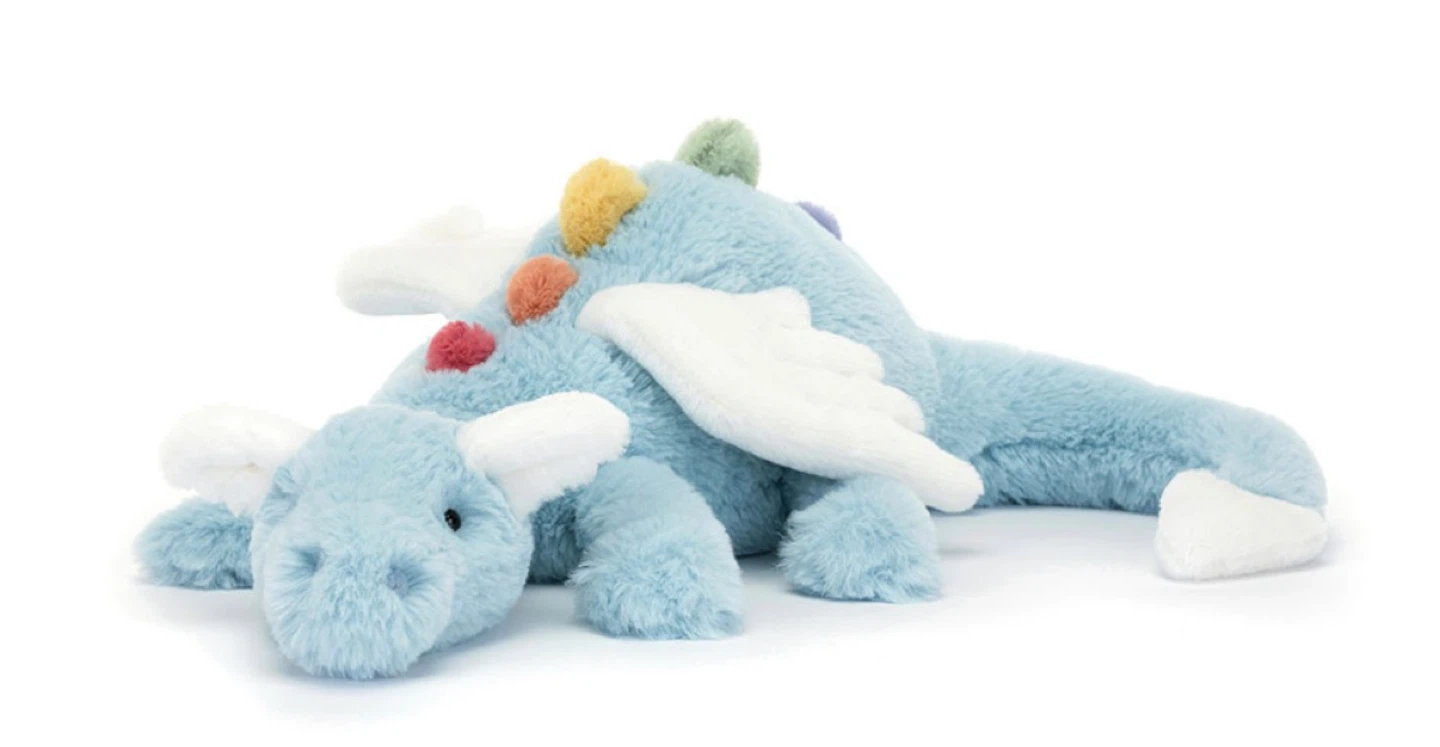This is a soft, blue Jellycat Dexter Dragon plush toy with colourful pom-pom spikes and white wings. It's made from a fuzzy material, perfect for snuggles. This dragon is a great size for playtime or decoration.
