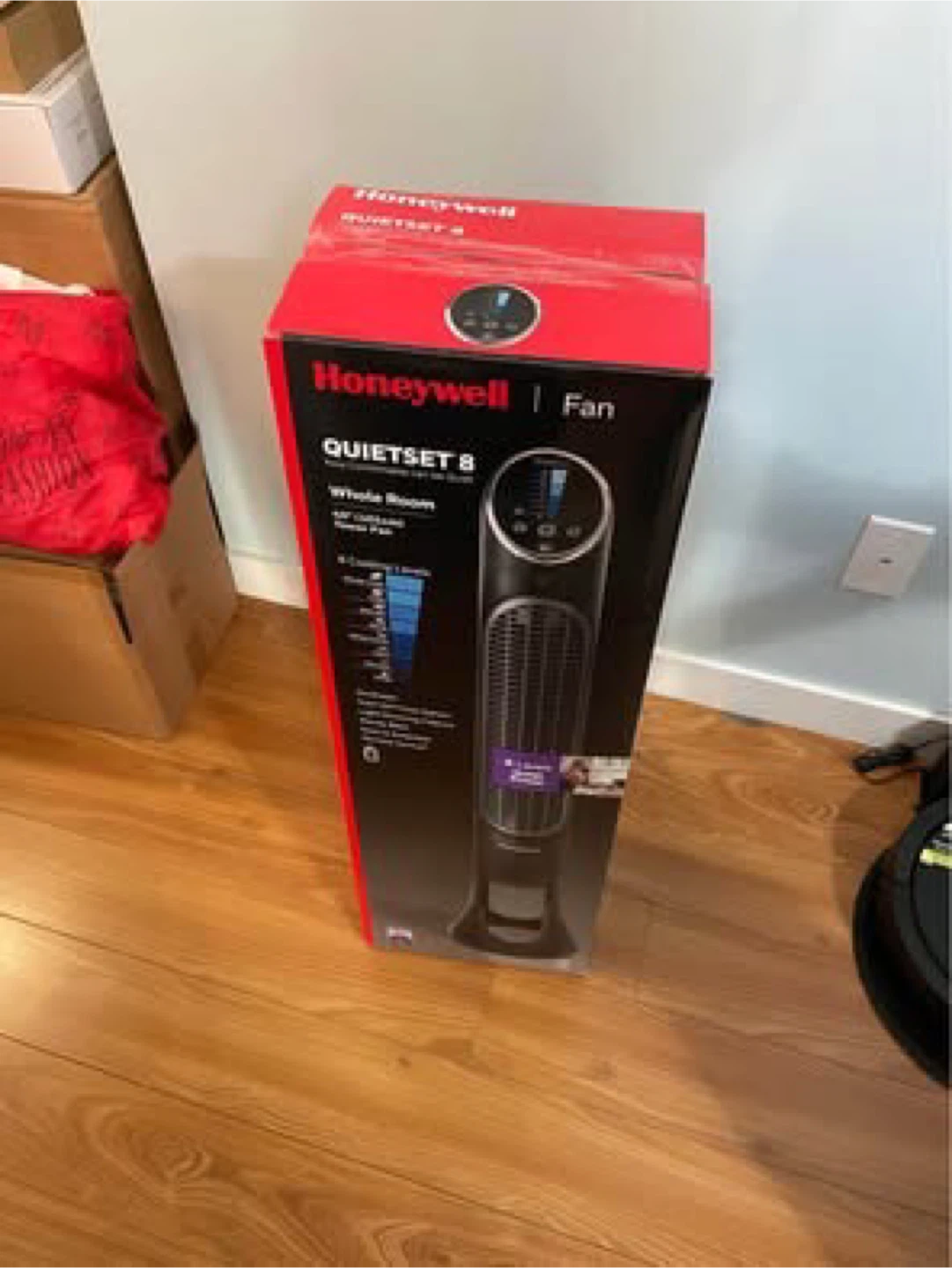 Honeywell QuietSet 8 tower fan. Whole room cooling with 5 speed settings and timer functions. Includes remote control.