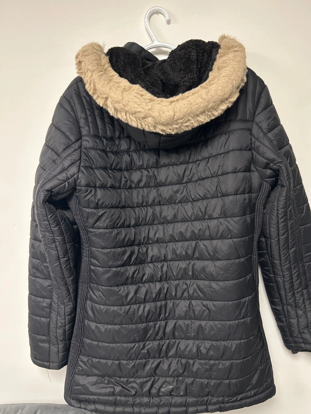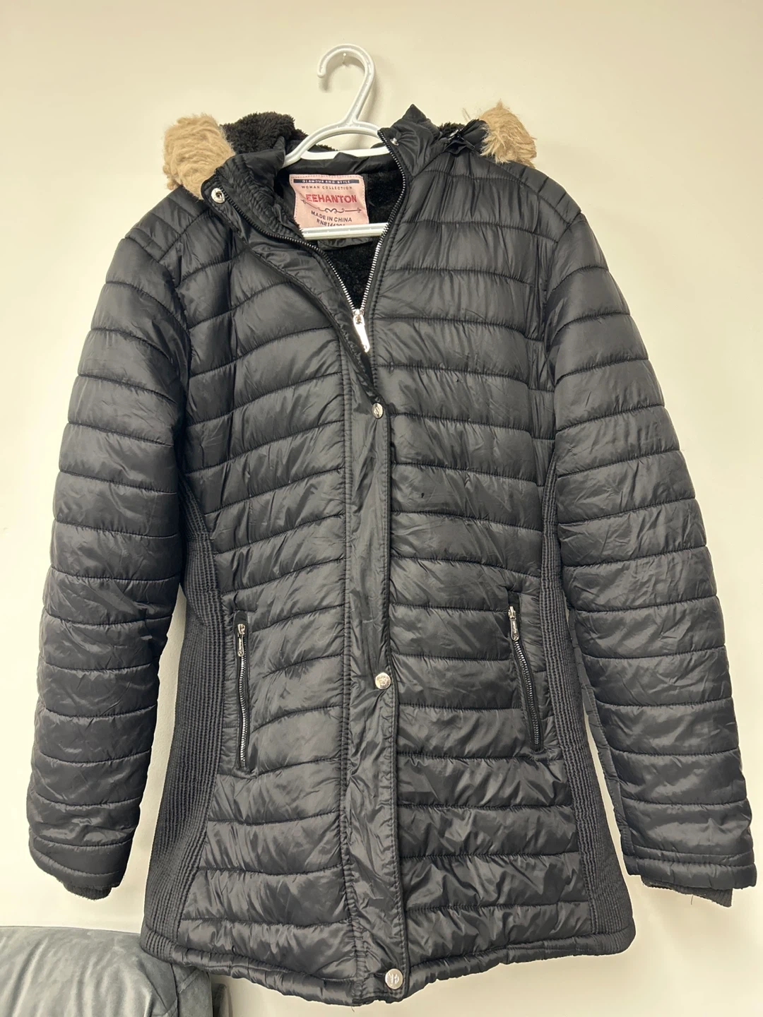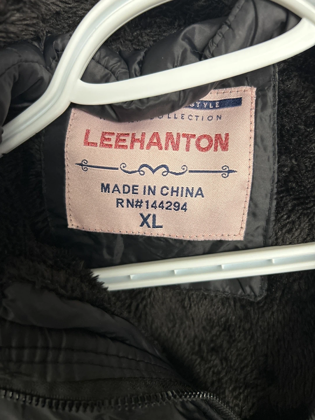 This black puffer jacket is from Leehanton and is a size XL. It features a faux fur-lined hood for extra warmth. It's perfect for chilly weather!