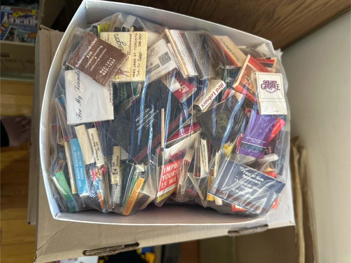 A large collection of vintage matchbooks from various Toronto businesses. Includes restaurants like Red Lobster and Golden Griddle, along with other establishments. Great for collectors or for use as a unique decor piece!