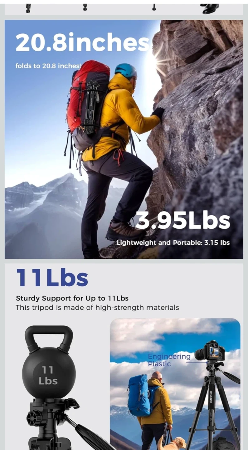 This SPEMUNTO tripod is made of aluminum alloy and high-strength engineering plastic. It supports up to 11 lbs and folds down to 20.8 inches, weighing only 3.15 lbs. Includes a phone and tablet holder, a wireless remote, and a carrying bag.