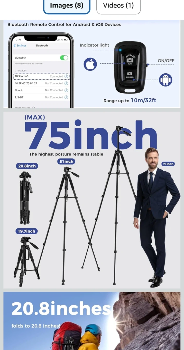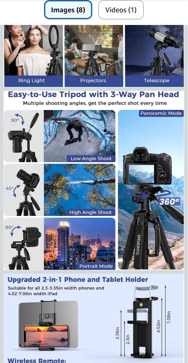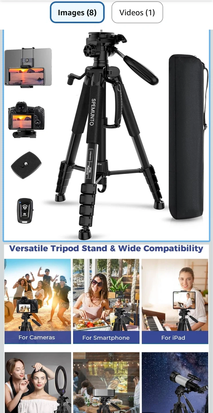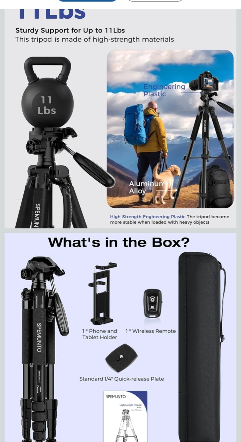 This SPEMUNTO tripod is made of aluminum alloy and high-strength engineering plastic. It supports up to 11 lbs and folds down to 20.8 inches, weighing only 3.15 lbs. Includes a phone and tablet holder, a wireless remote, and a carrying bag.