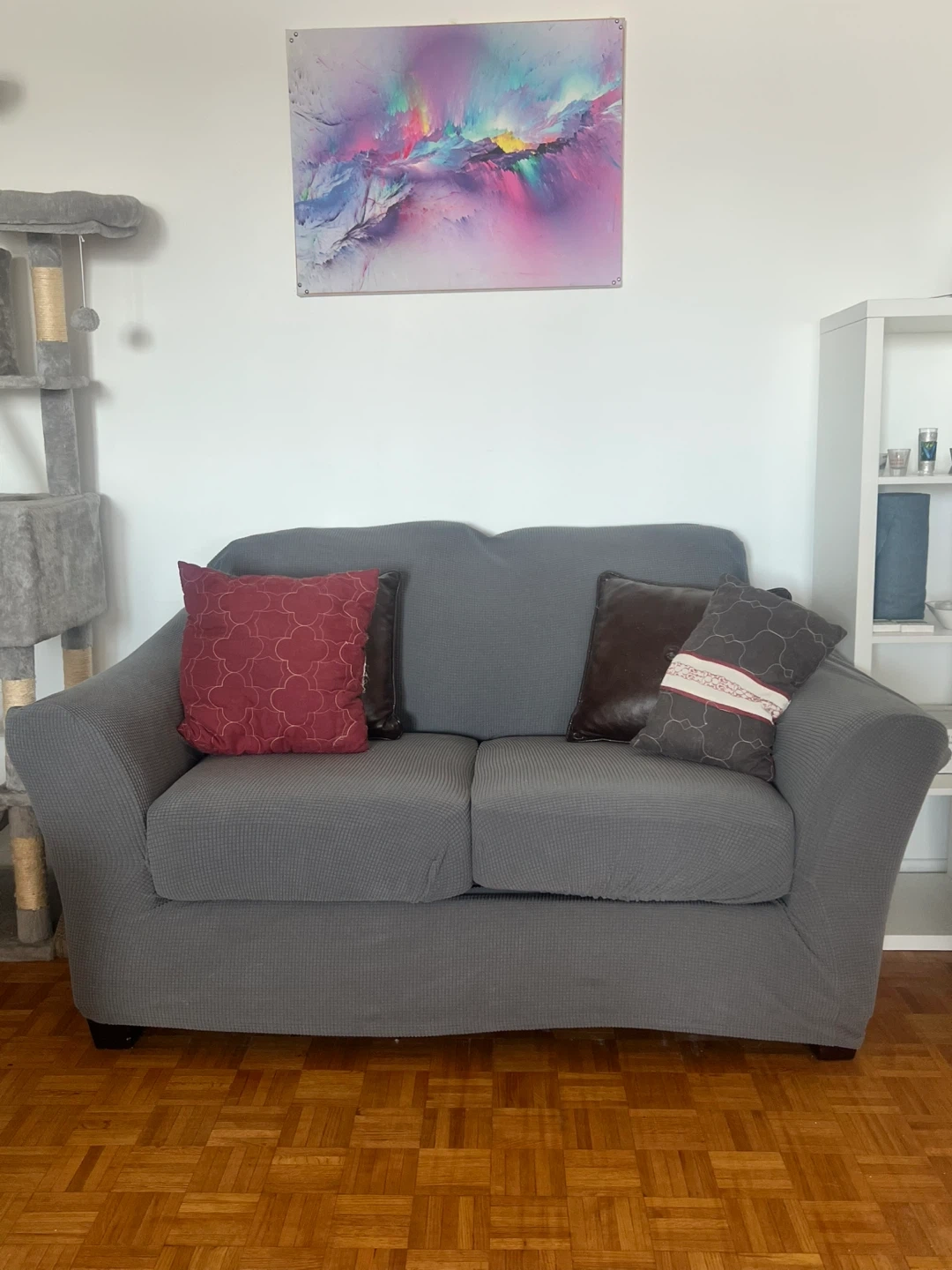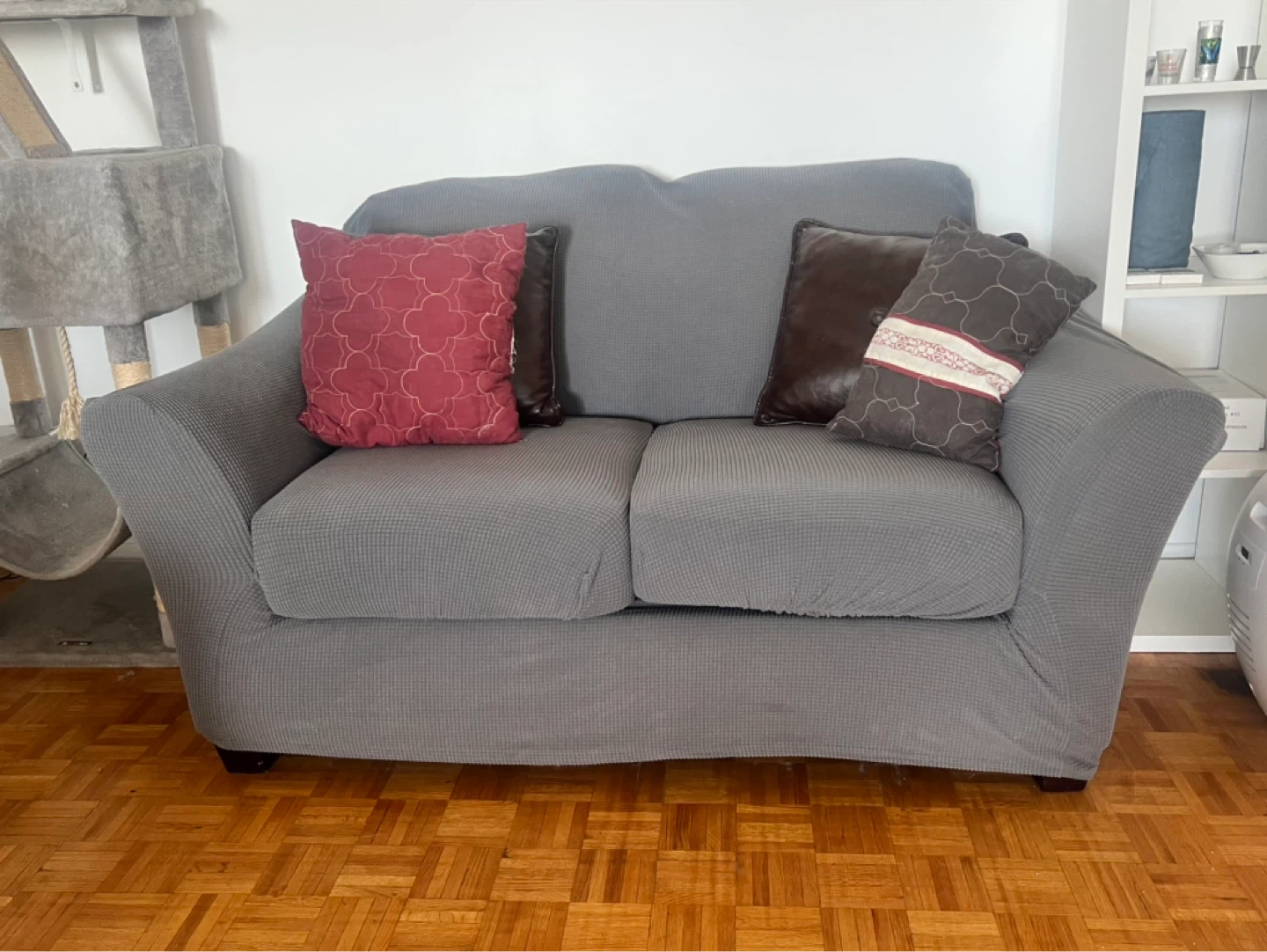 Grey textured fabric loveseat sofa. It has a two-cushion seat and back. Upholstered in a durable, stretchable fabric cover. Underneath the cover is fake leather, but my cat scratched it up, hence the couch cover. Decorative pillows included if desired. Pickup only.