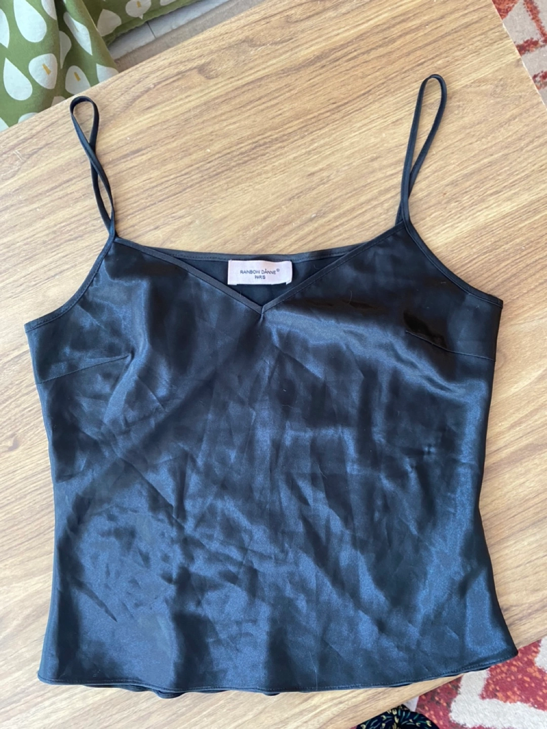 Selling a stylish black cami from Rainbow Daanan Paris. It's in great condition and perfect for layering or wearing on its own. The material has a nice sheen and feels comfortable against the skin. A versatile piece for any wardrobe!