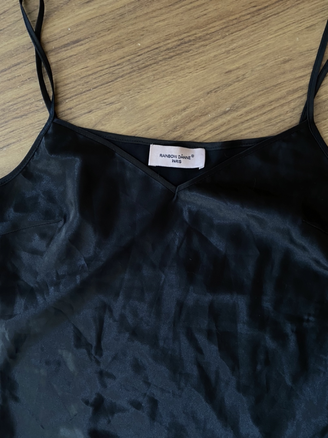 Selling a stylish black cami from Rainbow Daanan Paris. It's in great condition and perfect for layering or wearing on its own. The material has a nice sheen and feels comfortable against the skin. A versatile piece for any wardrobe!