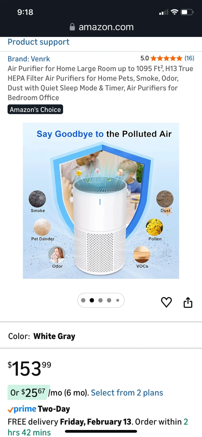 This Venrk air purifier offers H13 True HEPA 3-stage filtration for large rooms up to 1095 sq ft. It effectively removes smoke, odors, pet dander, dust, pollen, and VOCs. Features quiet operation with a sleep mode and timer.