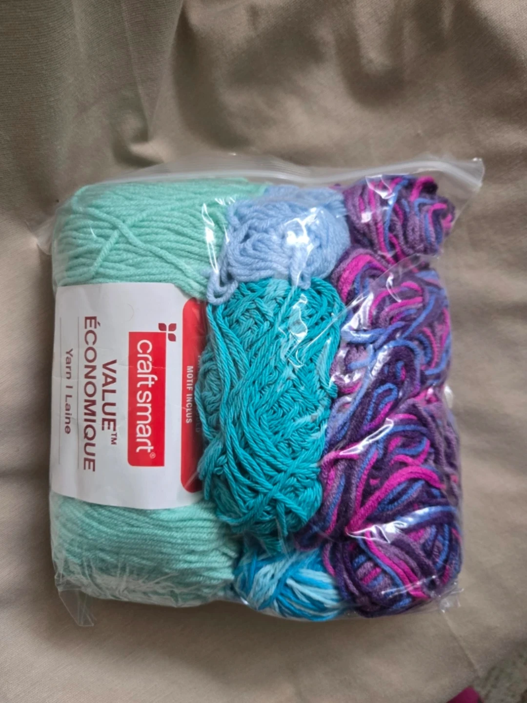 -One full ball of craftsmart teal yarn, -Craftsmart mutlicolour purple yarn,