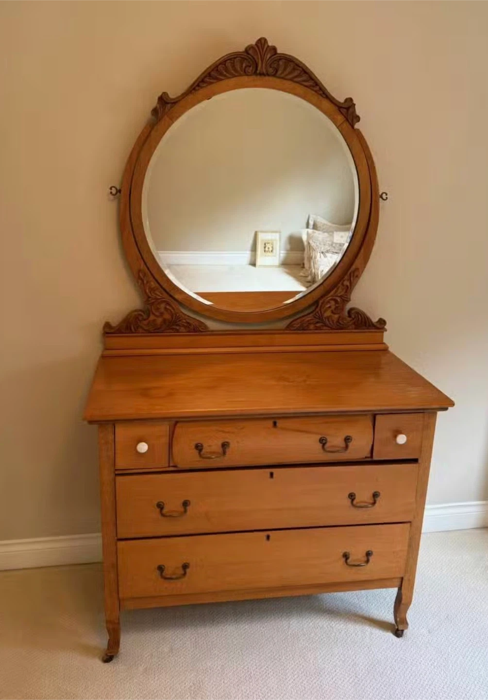 Vintage Maple Dresser with Carved Oval Mirror