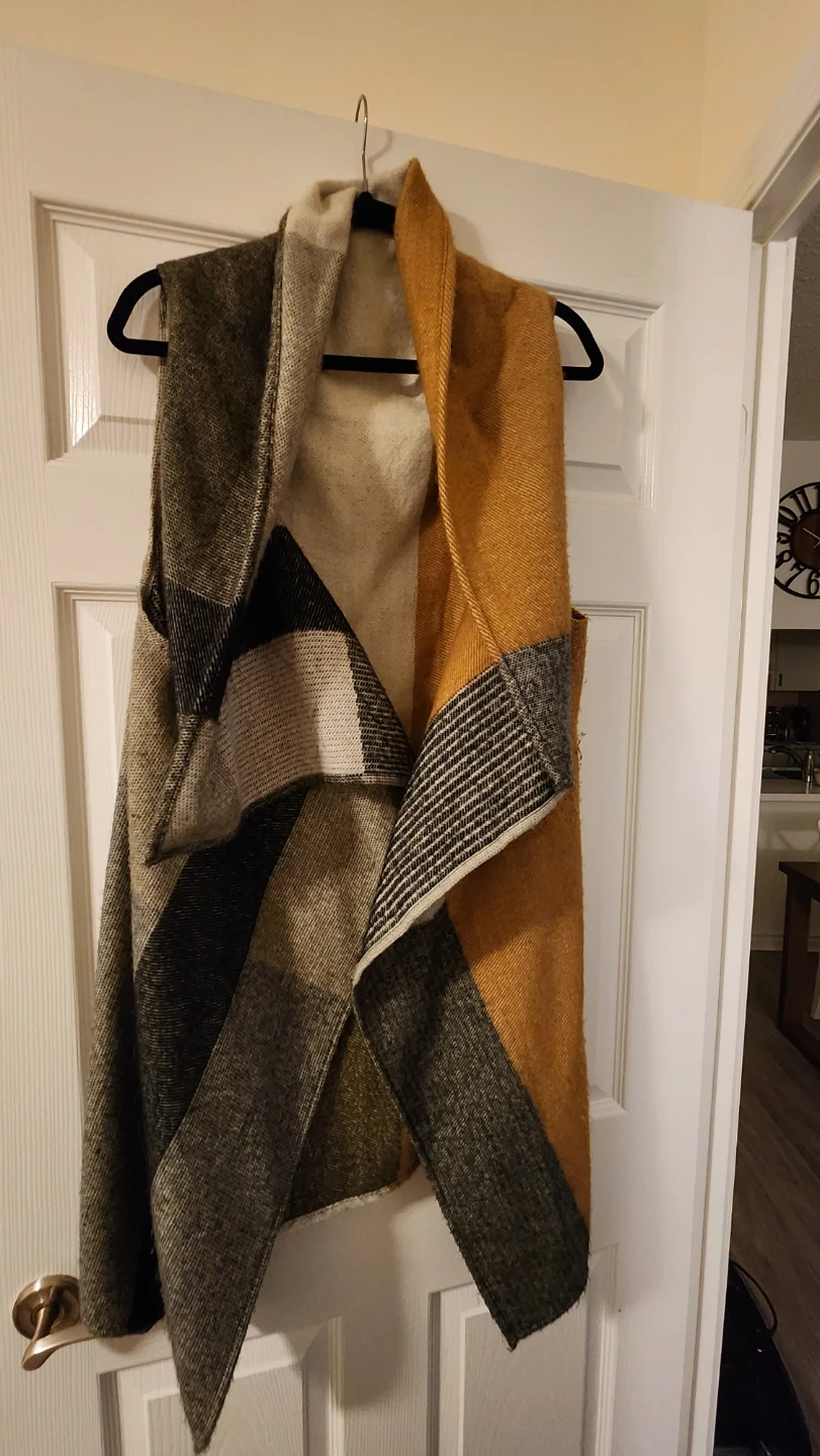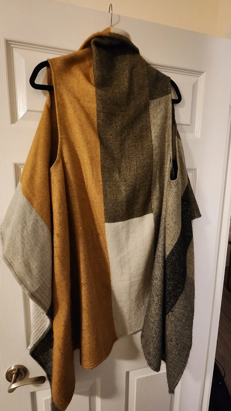 Cozy blanket scarf vest featuring a stylish colorblock design. It's made from a soft, woven material. This versatile piece is perfect for layering on cooler days! Super cute with a large belt to wear over leggings or jeans.