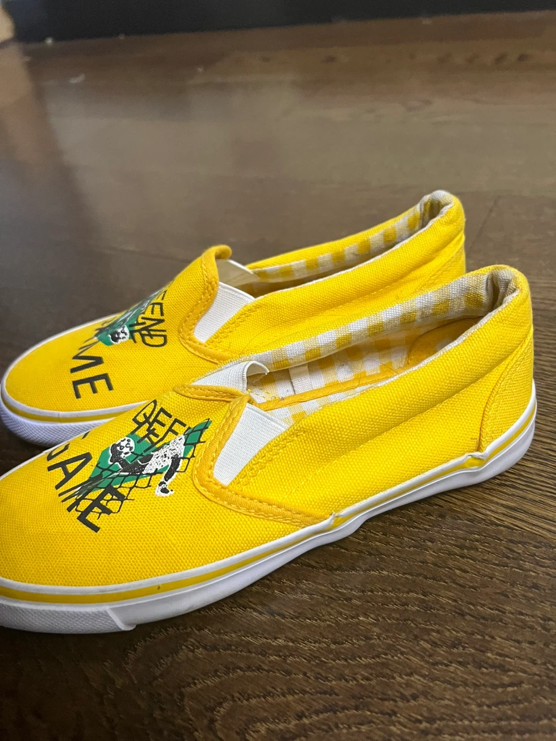 These yellow slip-on shoes are in good condition. They are from MAX branded from Qatar. They feature a fun graphic design on the front. The size is 34. Unworn and need gone asap
