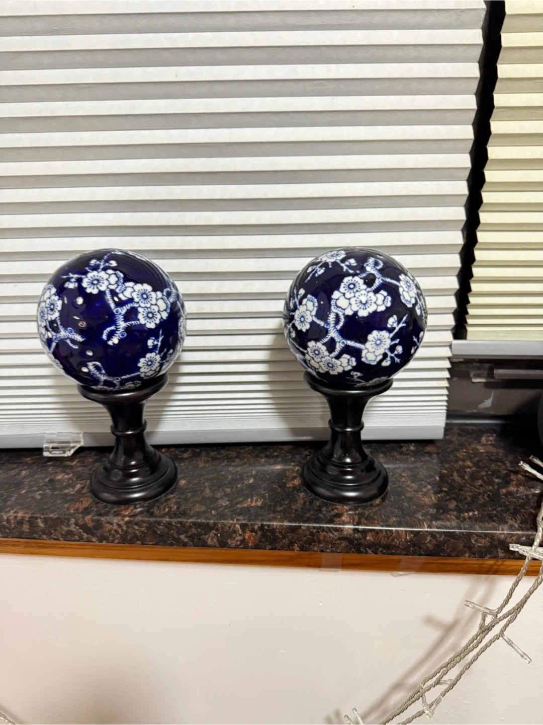 Set of two decorative orbs with a blue and white floral pattern. These orbs are mounted on dark stands. They're perfect for adding a touch of classic style to any shelf or table. Ceramic material.
