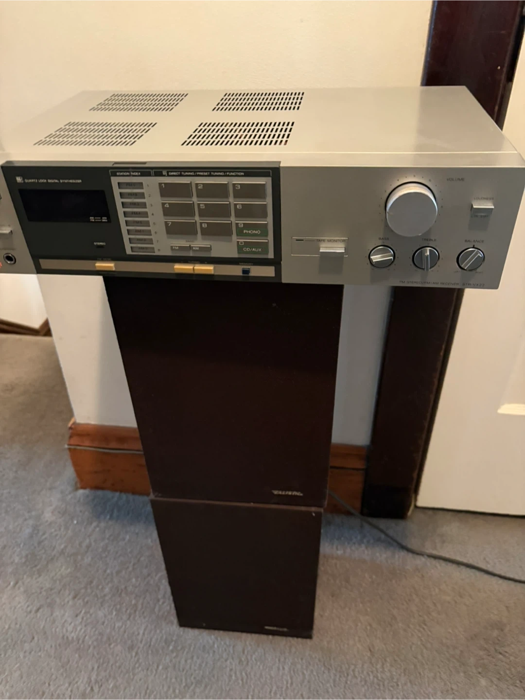 Sony STR-VX22 receiver with quartz lock digital synthesizer. It includes controls for volume, bass, treble, and balance. Also has inputs for Phono and CD/Aux.