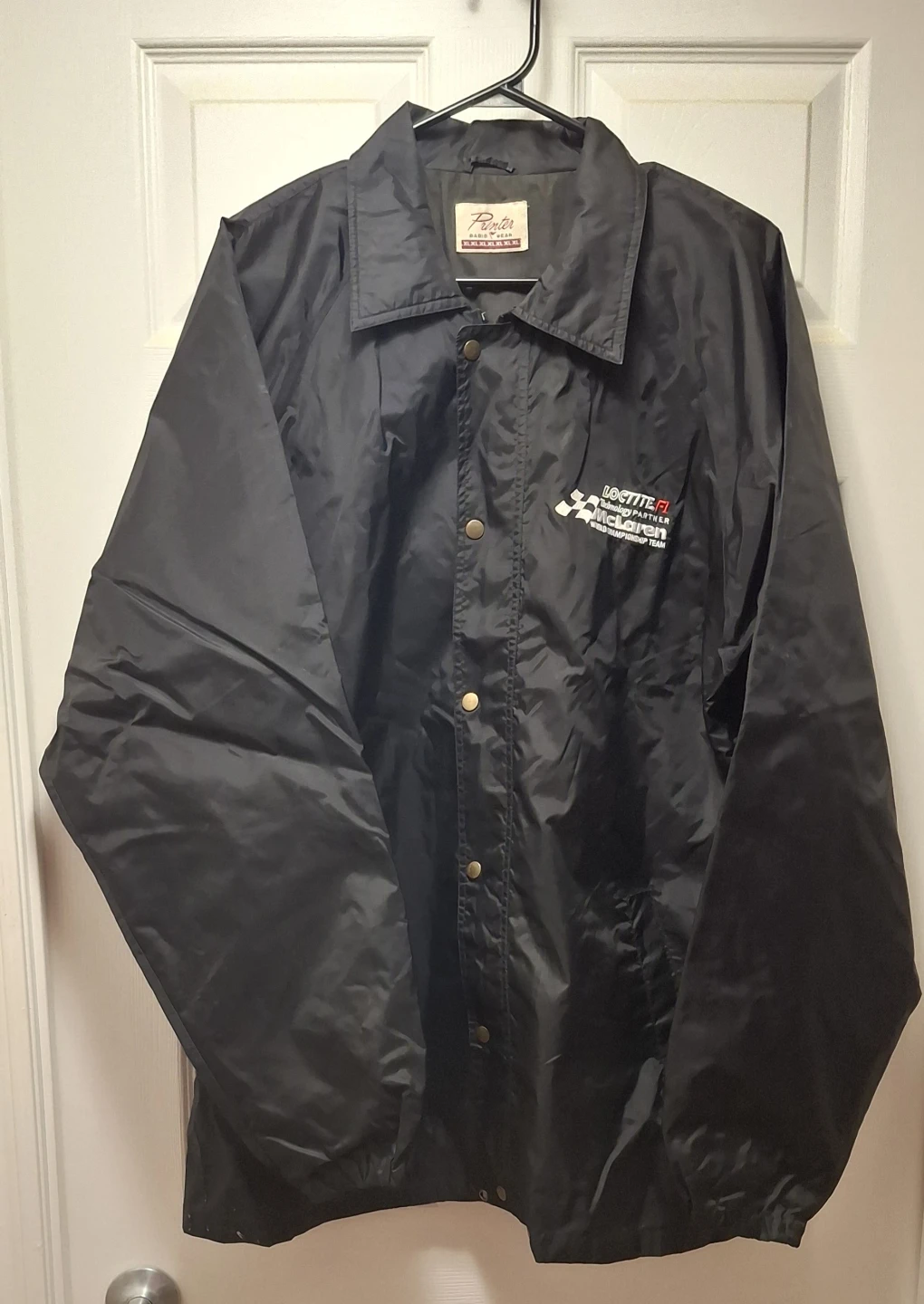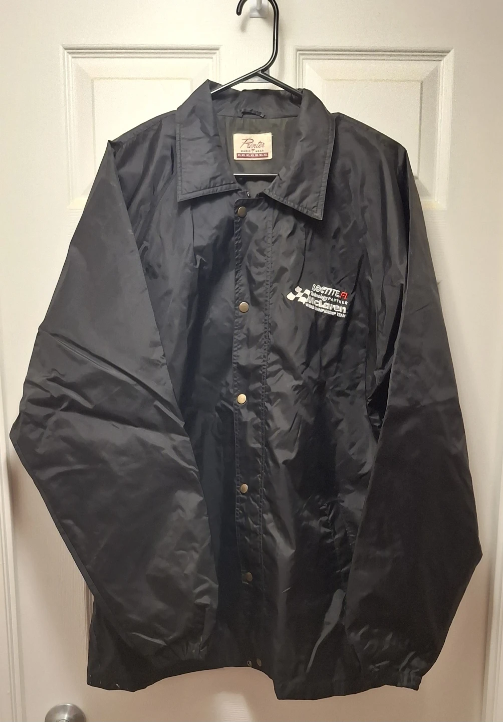 A lightly used all weather waterproof black jacket with elasticized cuffs. The jacket has McLaren World Championship Team embroidered logo.