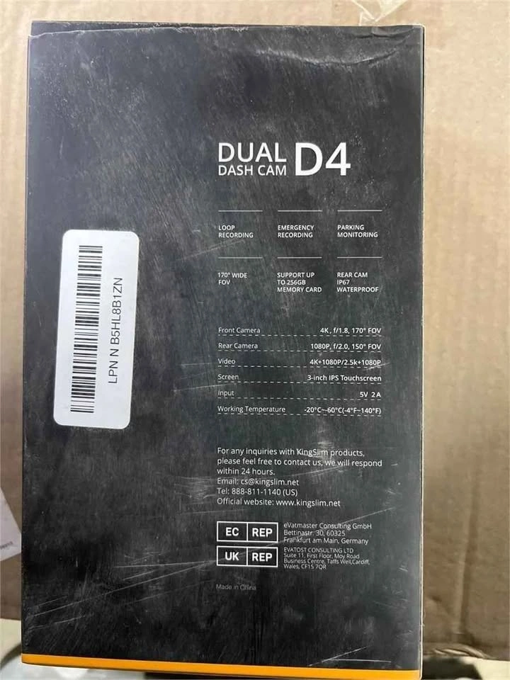 Kingslim D4 dual dash cam with front 4K and rear 1080P recording. Features built-in WiFi and GPS for app control, route, and speed logging. Includes Sony STARVIS sensor and WDR for clear night vision. Supports G-sensor, parking monitoring, and loop recording. SD card not included. Item has been opened but is in excellent, like-new condition. Photos are for reference only.
