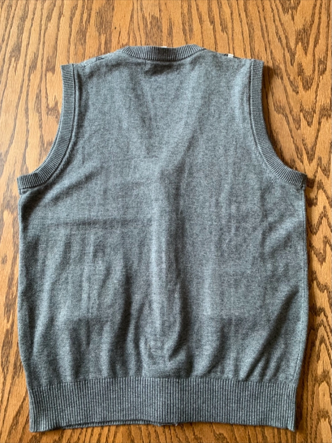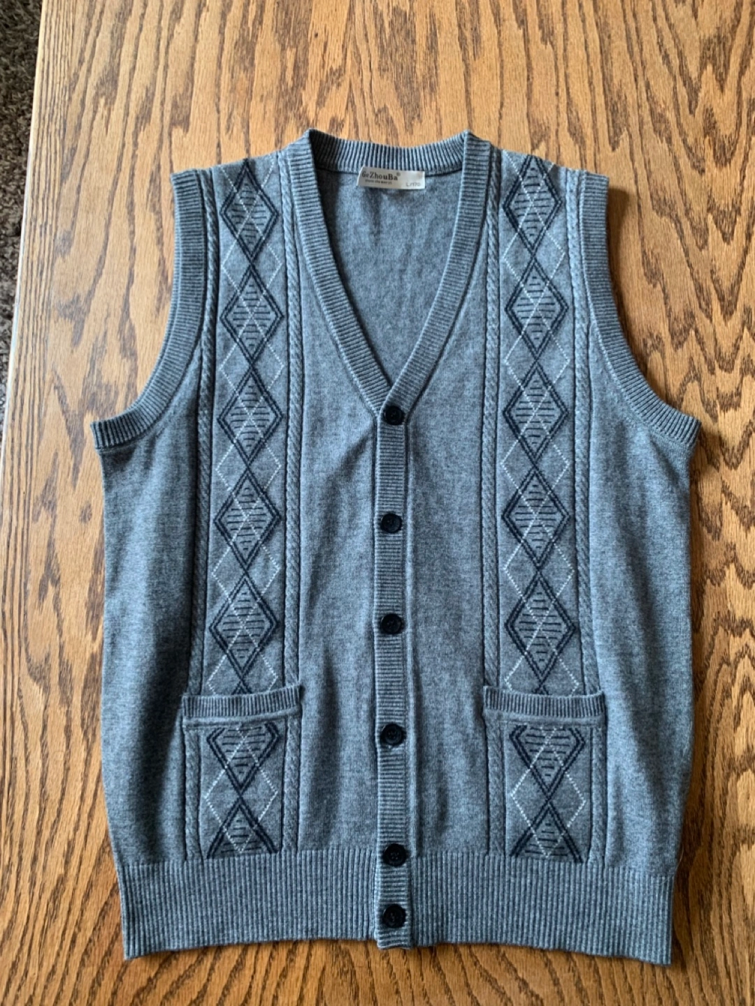 Very soft GeZhouBa vest in size L. It's a stylish grey colour with a classic argyle pattern. The material is a blend of wool, acrylic, and other fibres, making it comfortable to wear. Perfect for layering!