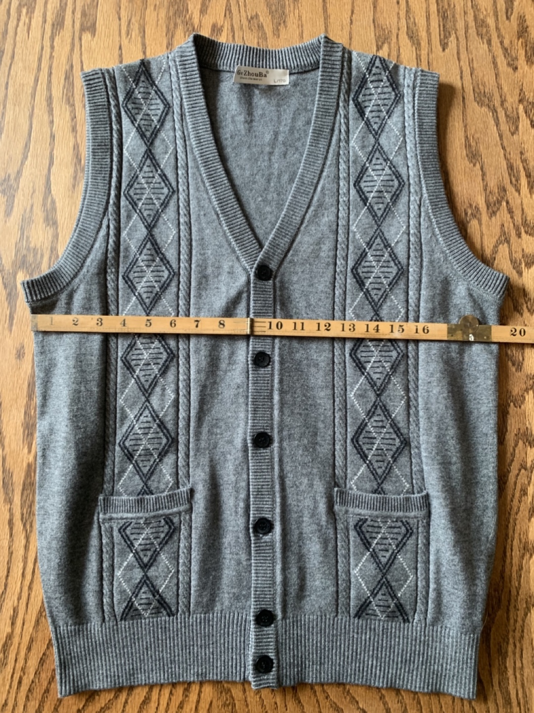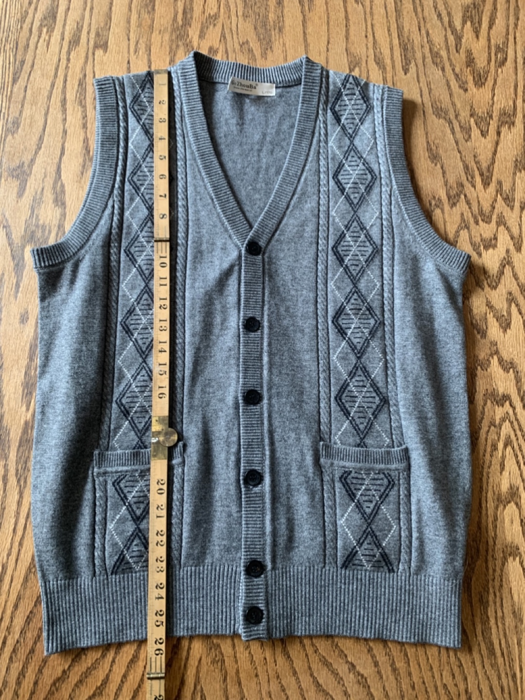 Very soft GeZhouBa vest in size L. It's a stylish grey colour with a classic argyle pattern. The material is a blend of wool, acrylic, and other fibres, making it comfortable to wear. Perfect for layering!
