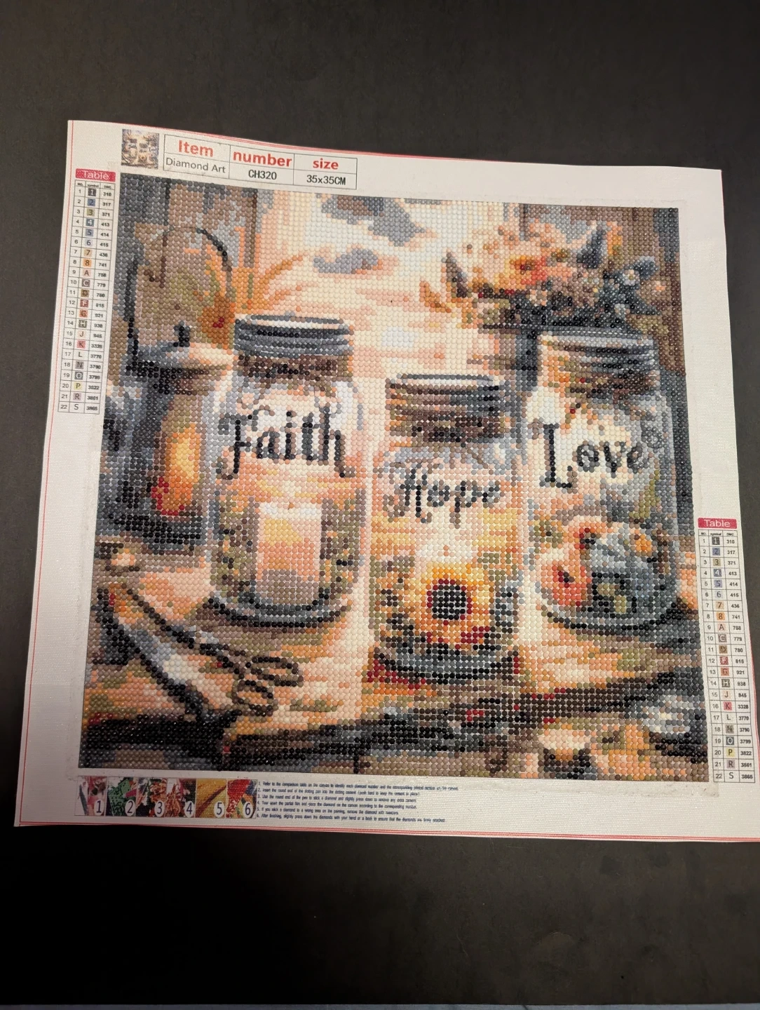 This is a diamond art painting kit featuring three mason jars with the words Faith, Hope, and Love. It comes with the canvas and diamonds needed to complete the picture. The canvas size is 40X40cm.