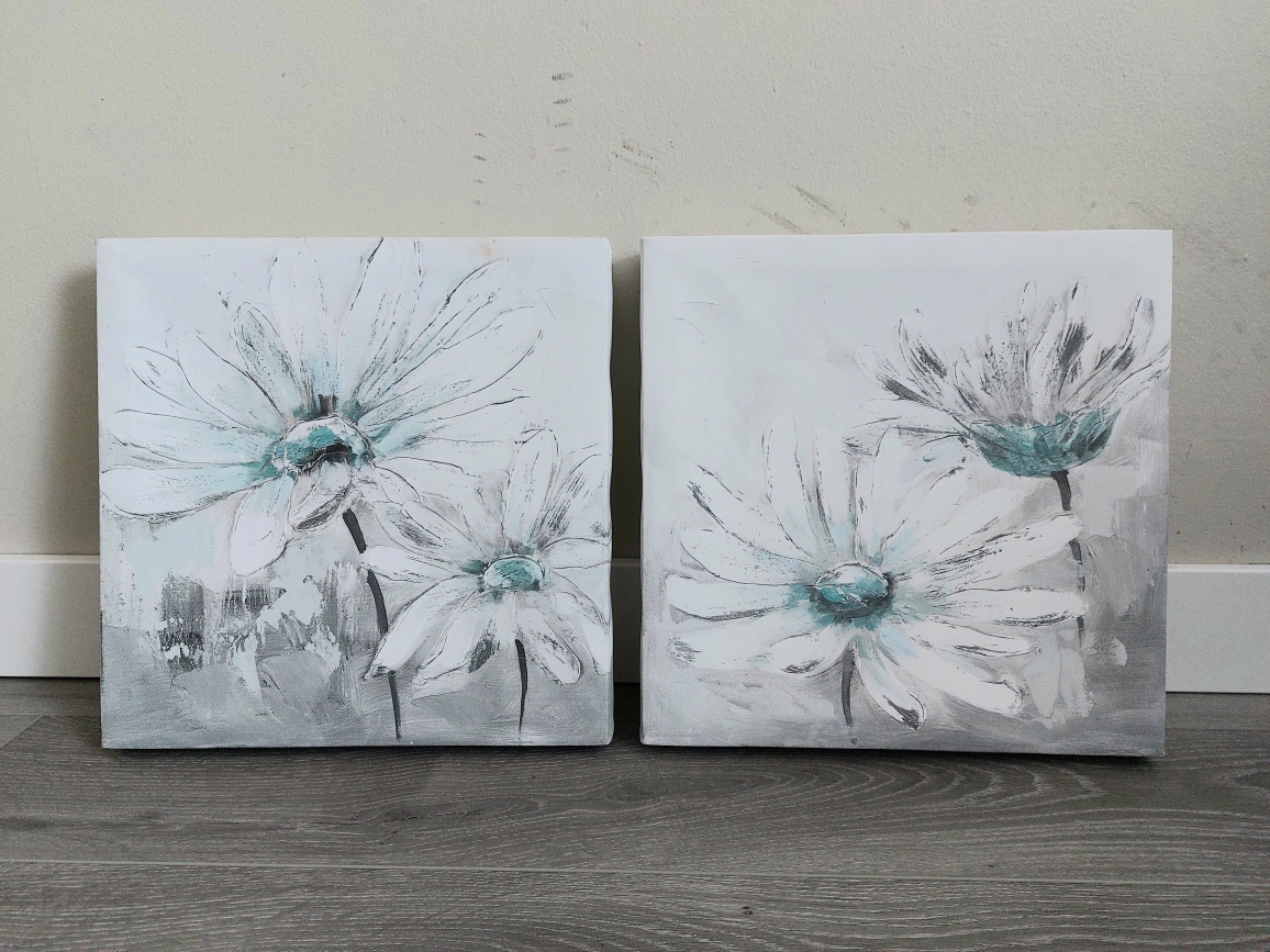 Set of two canvas prints. Floral design. White flowers on a grey background with teal accents. Ready to hang.
