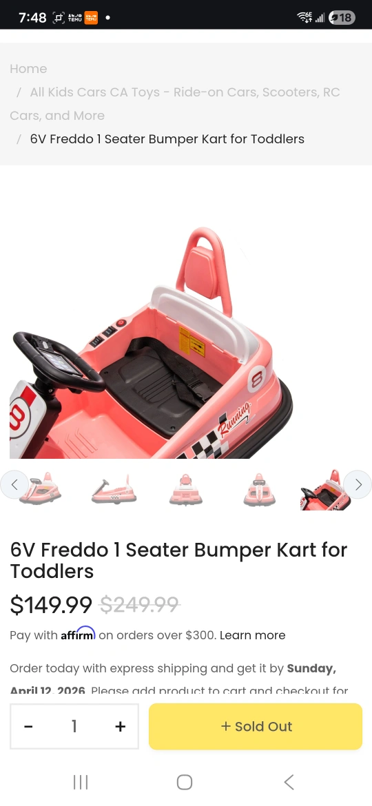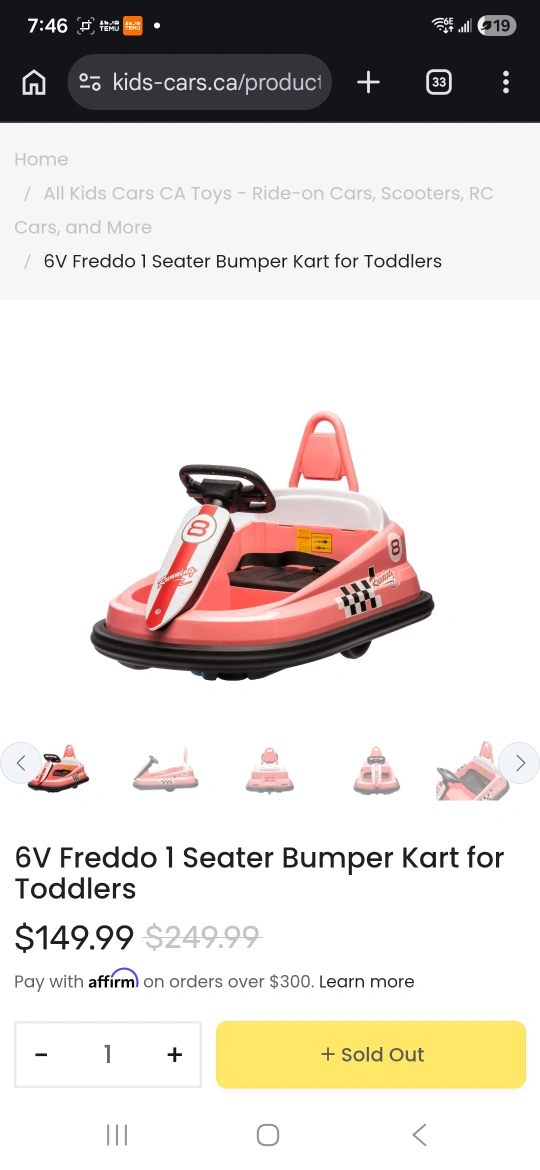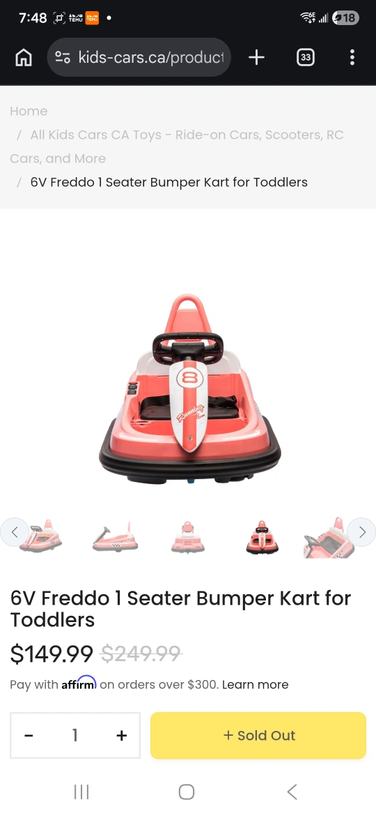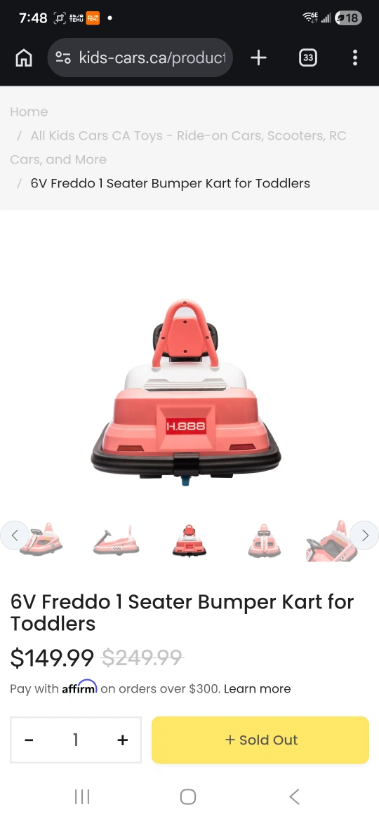 Buy & Sell6V Freddo 1 Seater Bumper Kart for Toddlers6V Freddo 1 Seater Bumper Kart for Toddlers$135This is a 6V Freddo 1 seater bumper kart. It's pink and white with a racing theme. Suitable for toddlers to enjoy indoor or outdoor fun! nwe in box ConditionNewWHERE TO MEETCloverdale 173a streetView MapSELLERverifiedSabiCloverdale600 reviews0 chats·1 favorites·10 viewsSEND CHAT TO SELLERHi Sabi! I’m interested in your listing.Hi Sabi! I’m interested in your listing.Get the Karrot app to chatSign In to chat