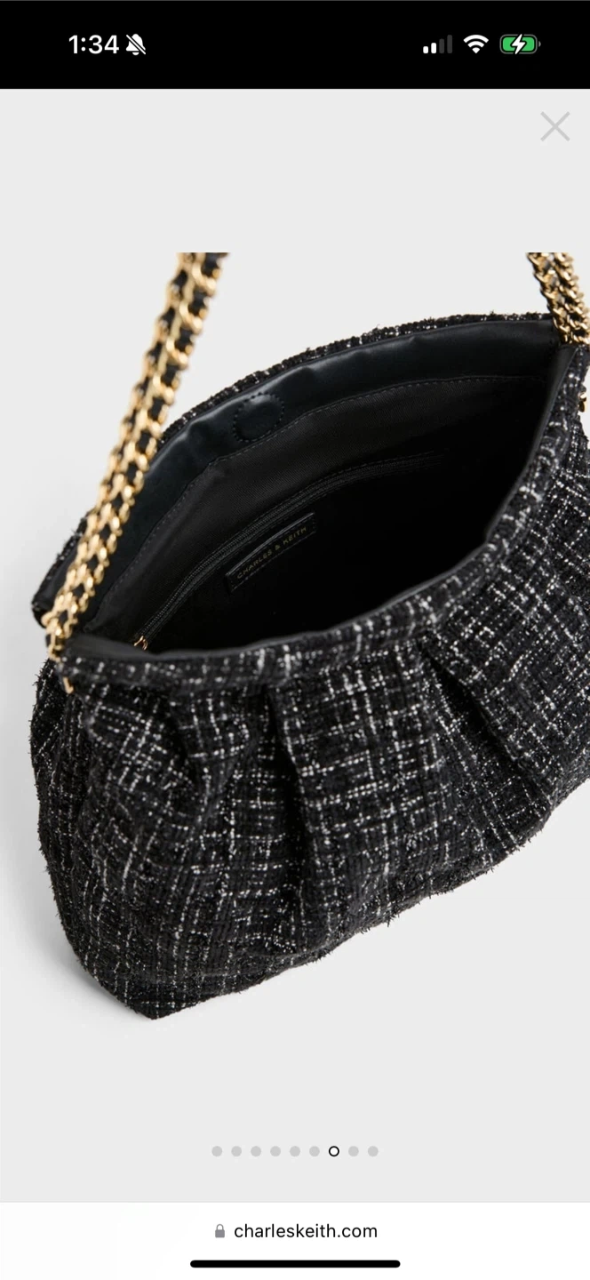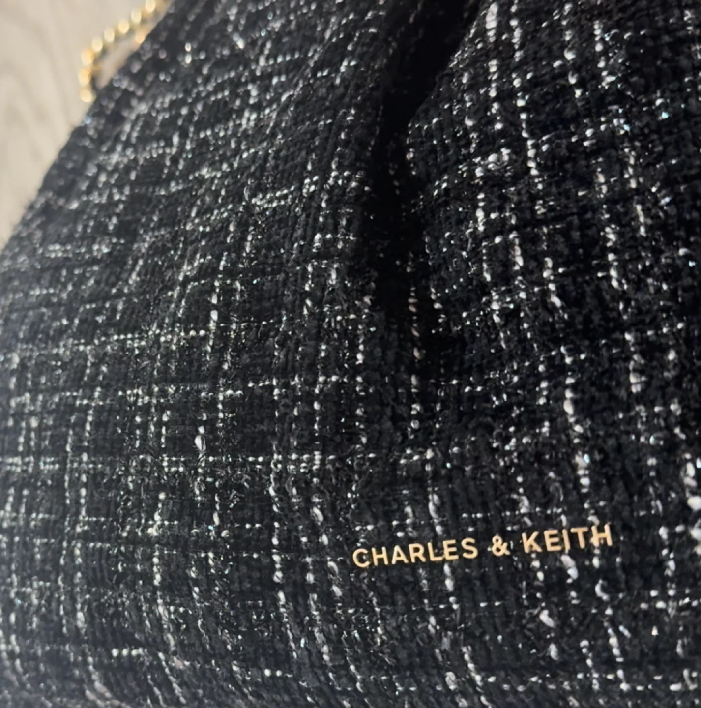 Selling a Charles & Keith Duo Tweed Double-Chain Hobo Bag in black tweed
