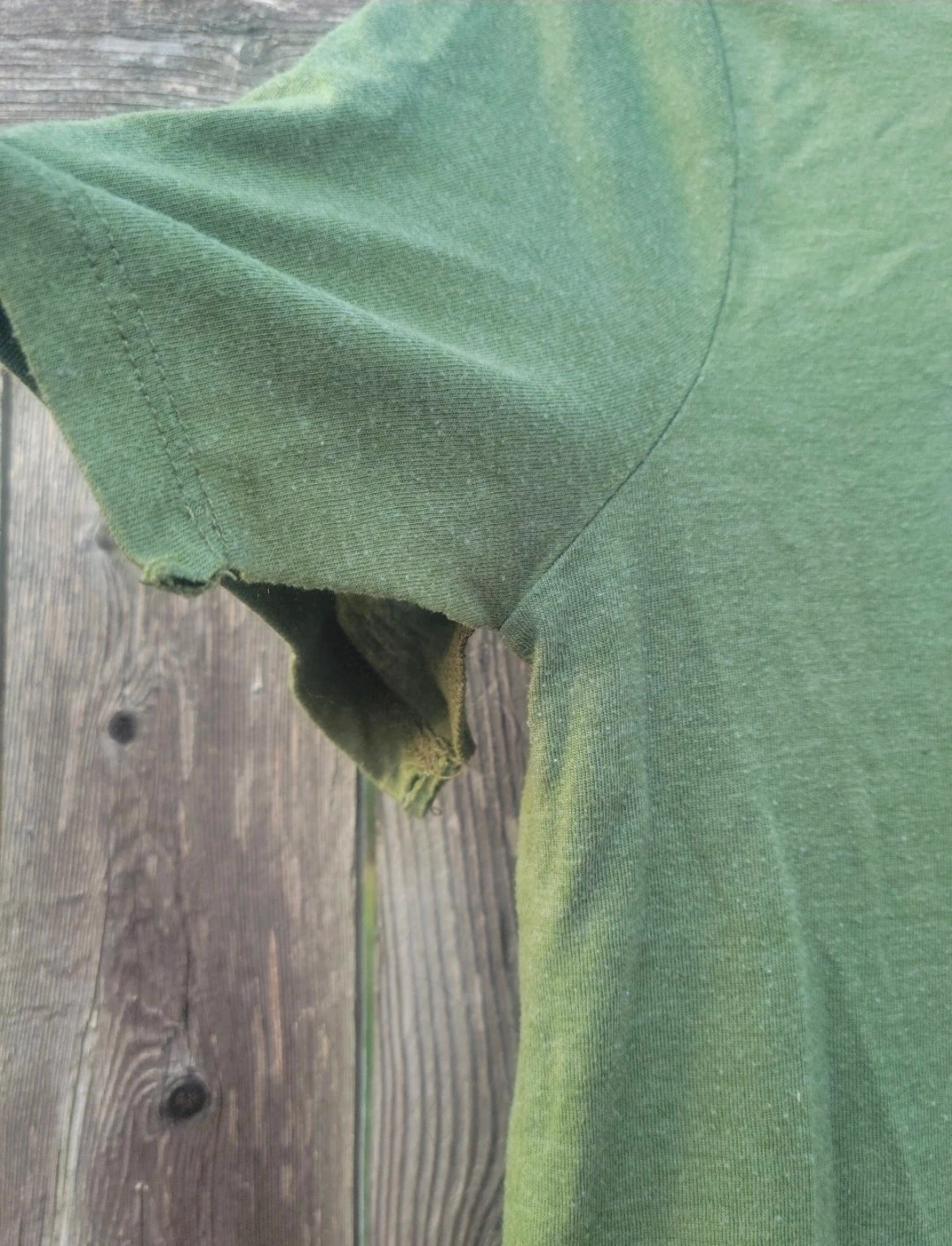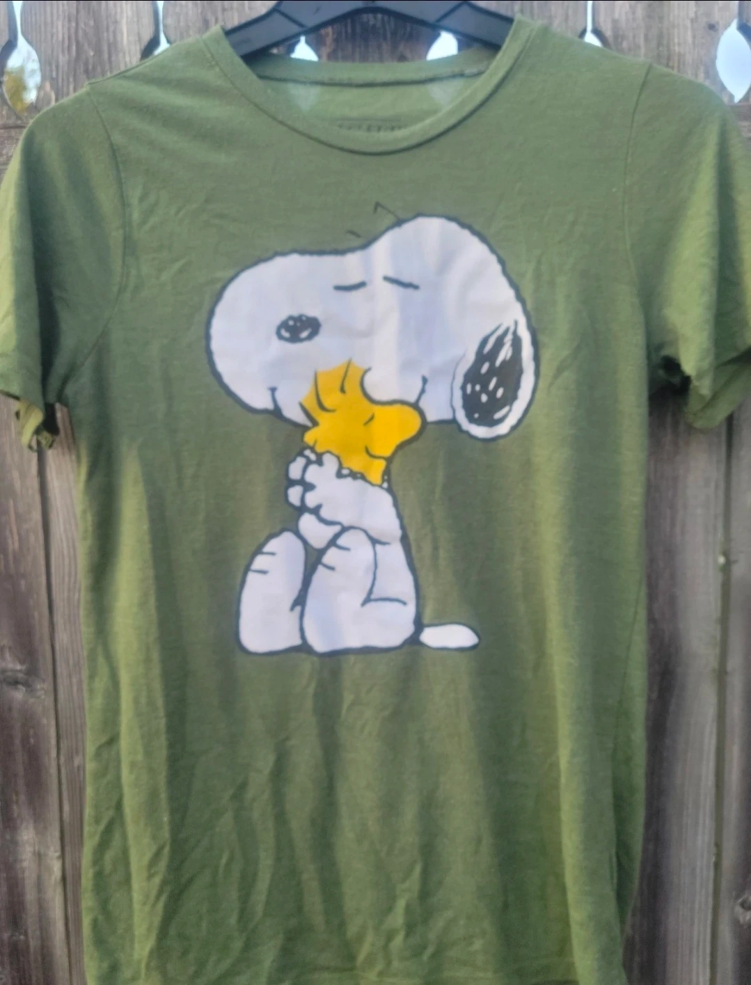 Green short-sleeve t-shirt featuring Snoopy and Woodstock graphic. 50% Polyester, 38% Cotton, 12% Rayon. Made in Mexico. Size is small.