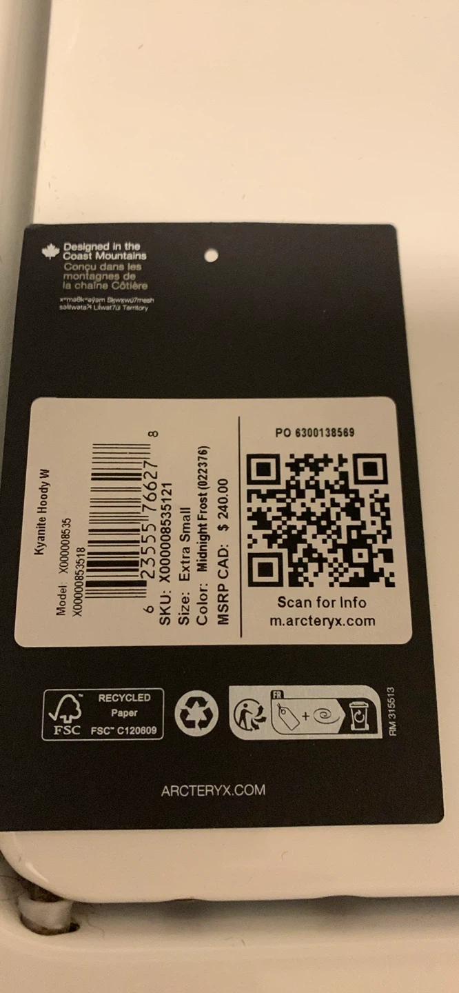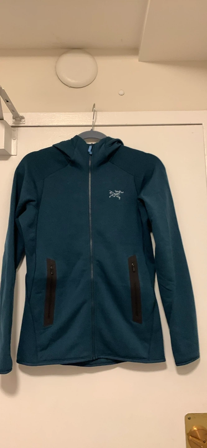 This is an Arc'teryx Kyanite Hoody W in Midnight Frost. It's an extra small size. The hoody is made of fleece material and features zippered pockets.