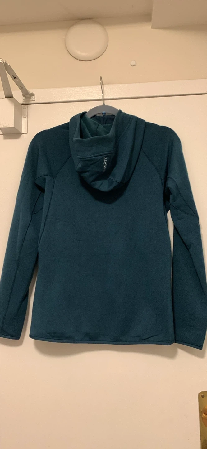 This is an Arc'teryx Kyanite Hoody W in Midnight Frost. It's an extra small size. The hoody is made of fleece material and features zippered pockets.