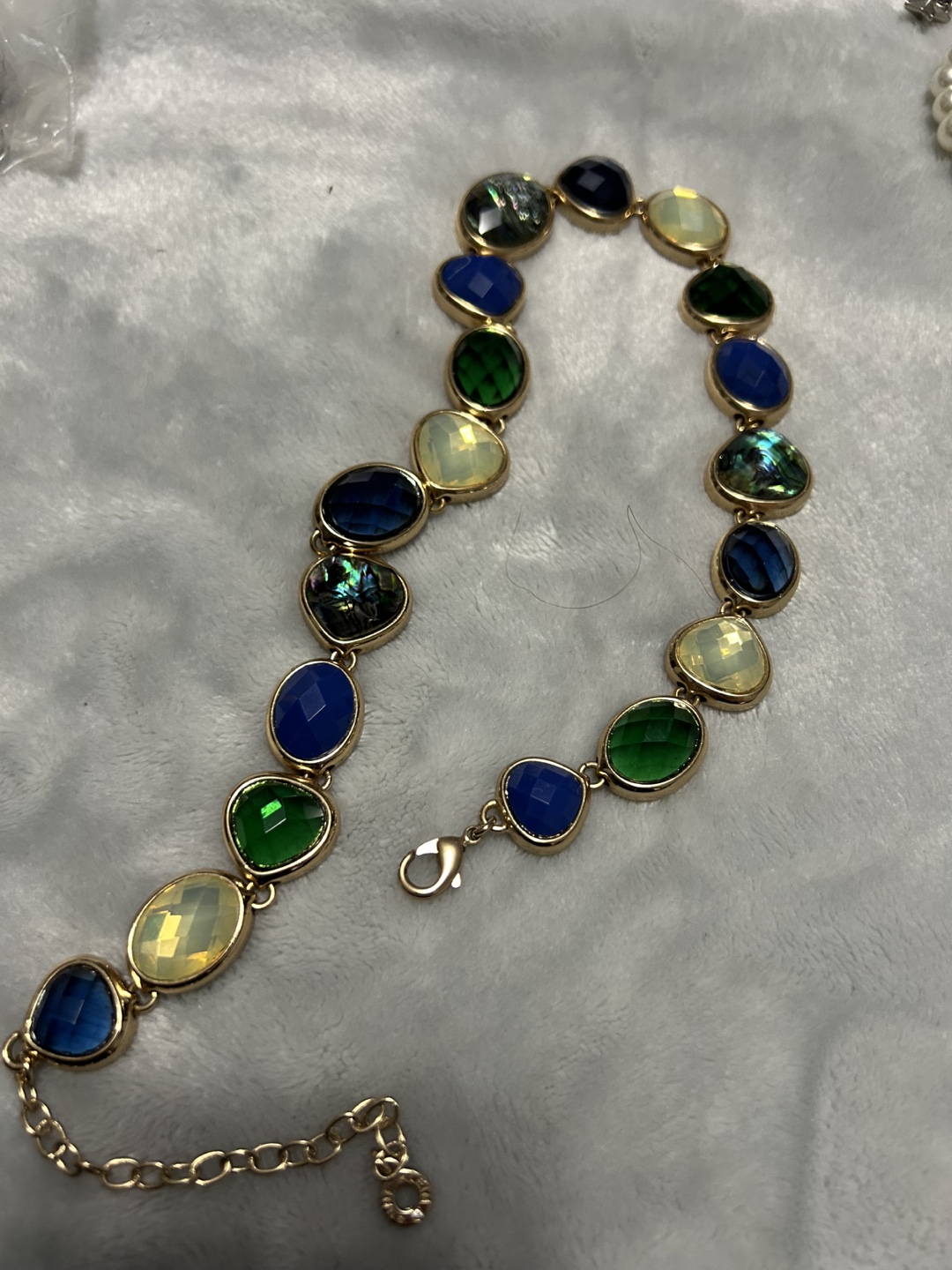 Bracelet featuring a row of colourful gemstones, with a gold-toned chain. It secures with a lobster clasp. This bracelet is a beautiful way to add some colour to any outfit.