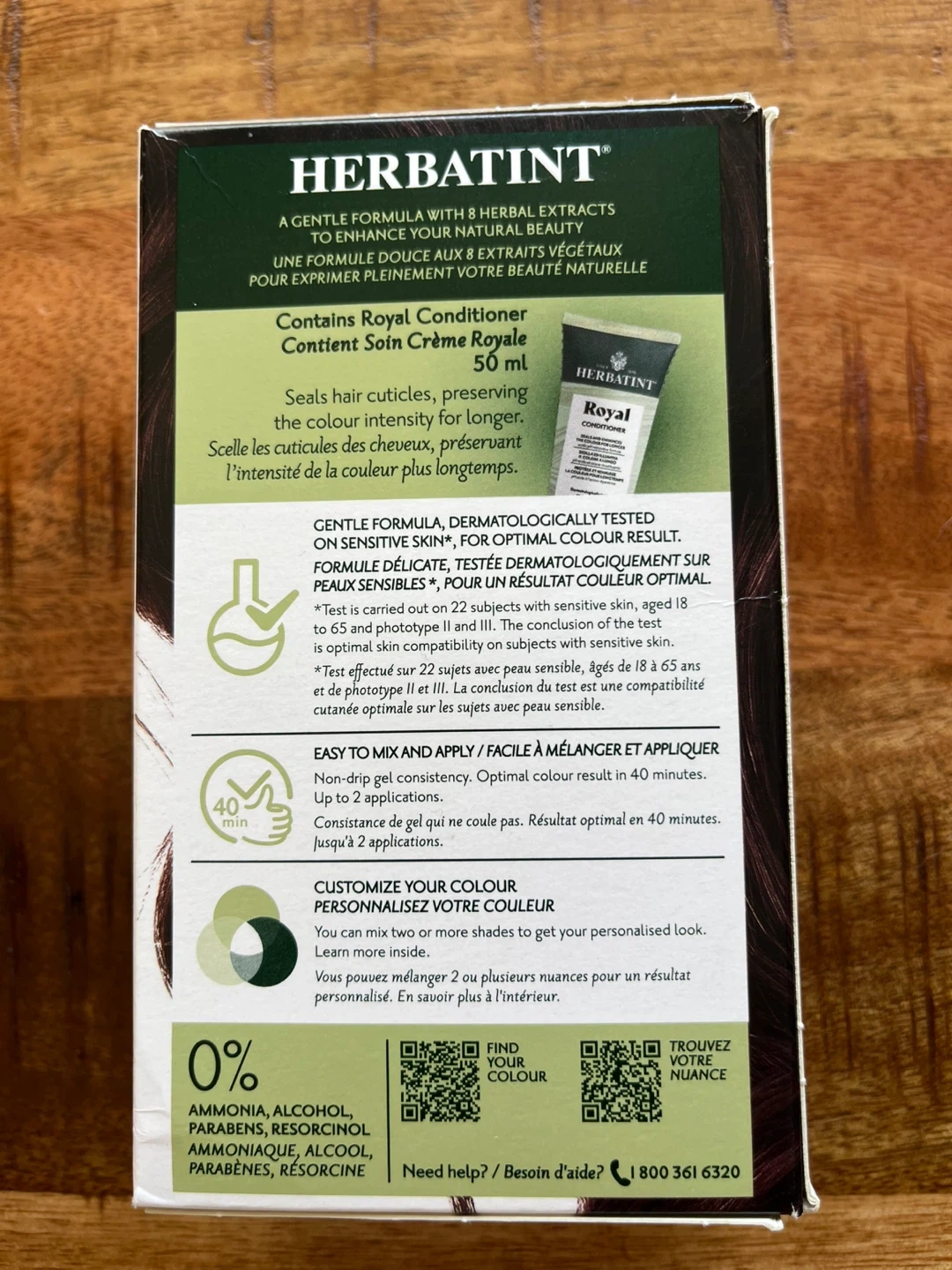 This is a permanent haircolour gel in shade 4R. It's a gentle formula with 8 herbal extracts to enhance natural beauty. The gel is easy to mix and apply, with an optimal colour result in 40 minutes,