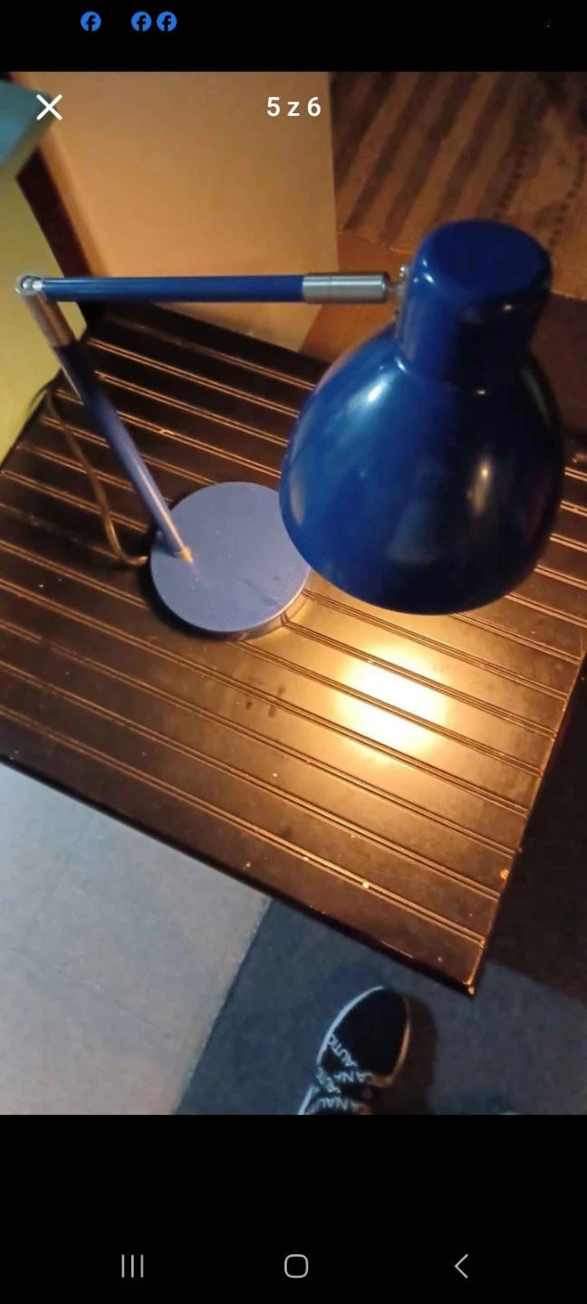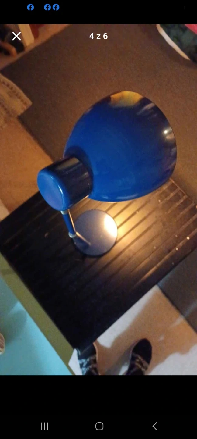 Navy blue with silver accents touch light adjustable desk lamp. Would look great on a desk in a home office. Measures approximately 6 inches by 6 inches by 25 inches tall.