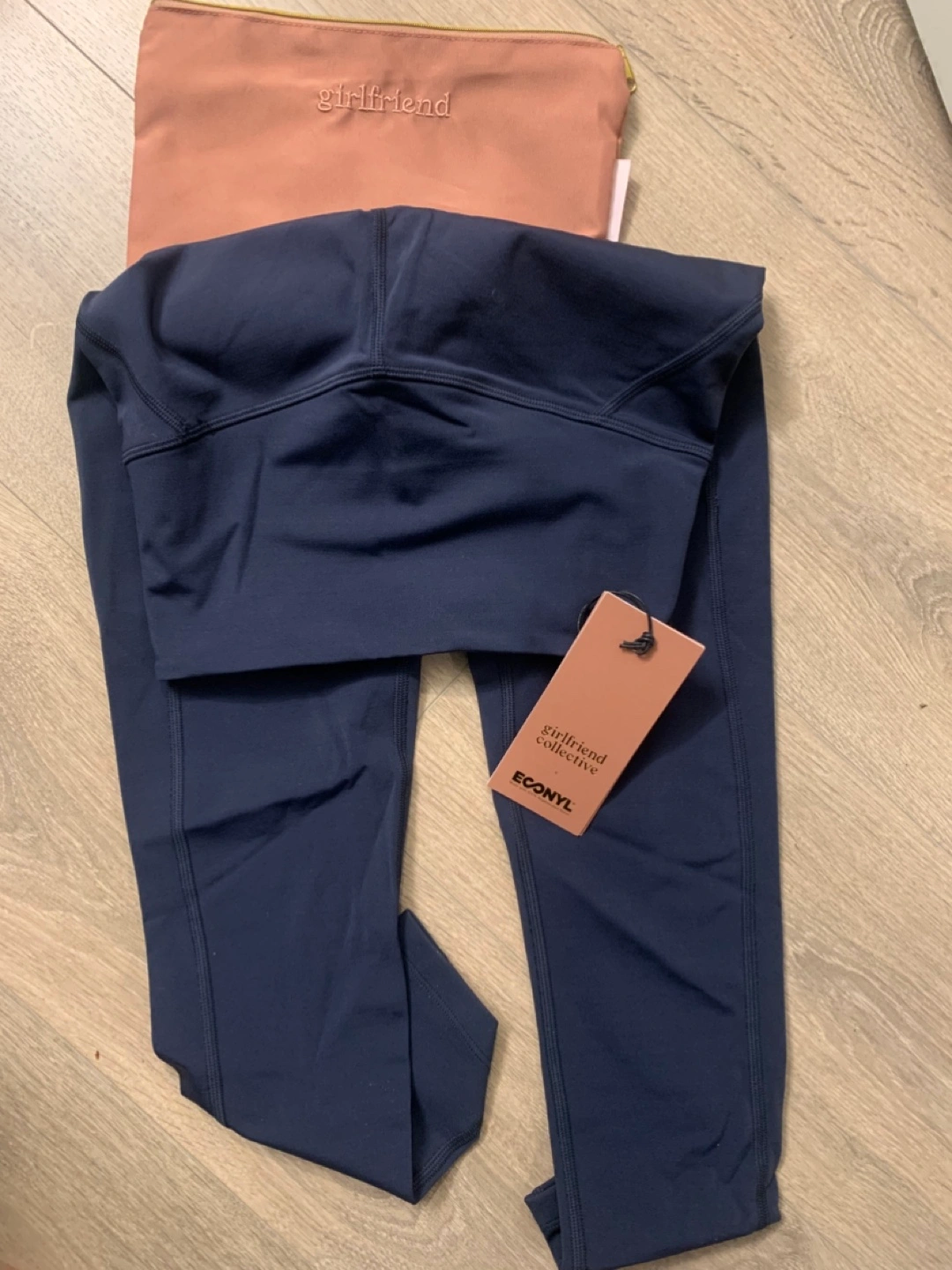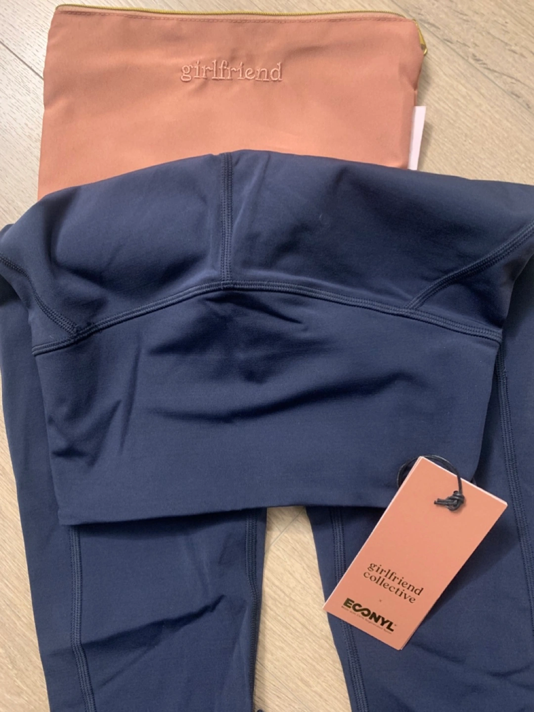 Girlfriend Collective high-rise leggings in navy blue. Made from ECONYL. Includes a matching branded pouch. Size small. New with tags.