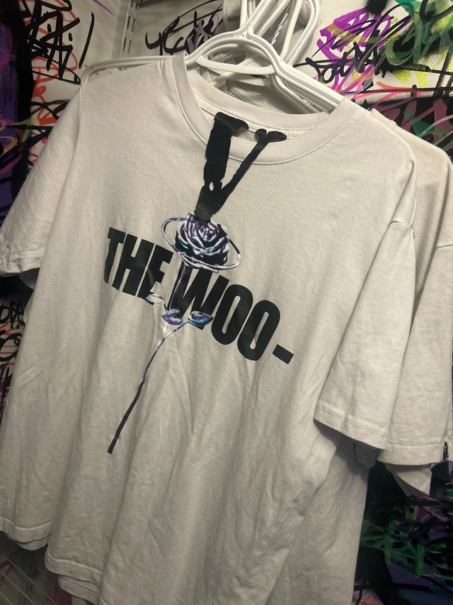 37Authentic VLONE x Pop Smoke “The Woo” tee in white. Size Large – fits small. Front features Pop Smoke “The Woo” graphic, back has signature orange VLONE logo. Good condition, no rips or stains. 100% authentic, from official VLONE x Pop Smoke drop.