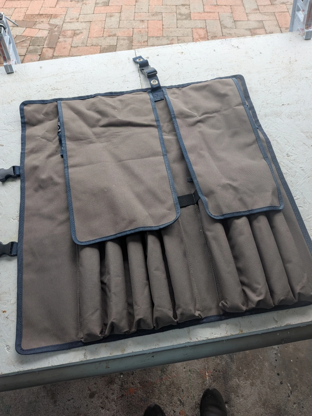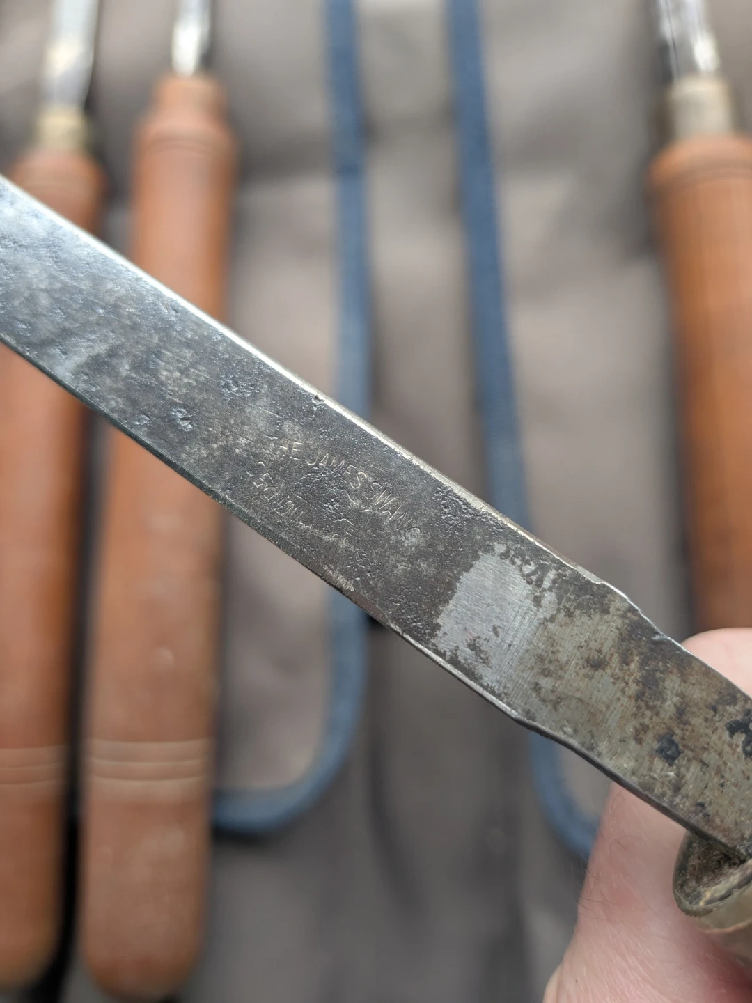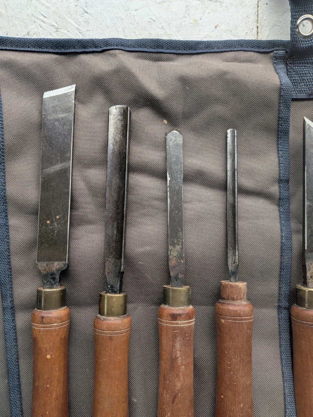 Includes a set of 8 wood carving chisels with wooden handles. Comes with a canvas roll-up case for storage and transport. The chisels are made of steel with brass ferrules and wooden handles. Two are missing the brass ferrules