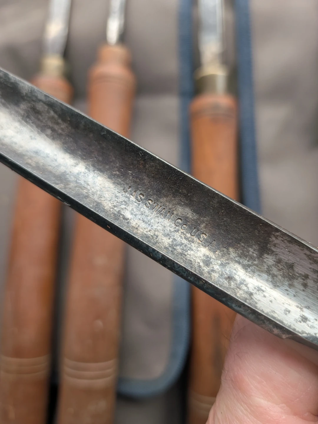 Includes a set of 8 wood carving chisels with wooden handles. Comes with a canvas roll-up case for storage and transport. The chisels are made of steel with brass ferrules and wooden handles. Two are missing the brass ferrules