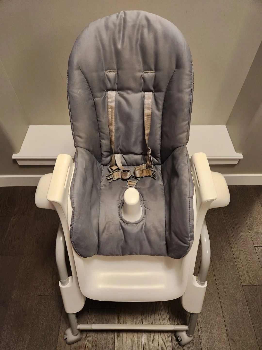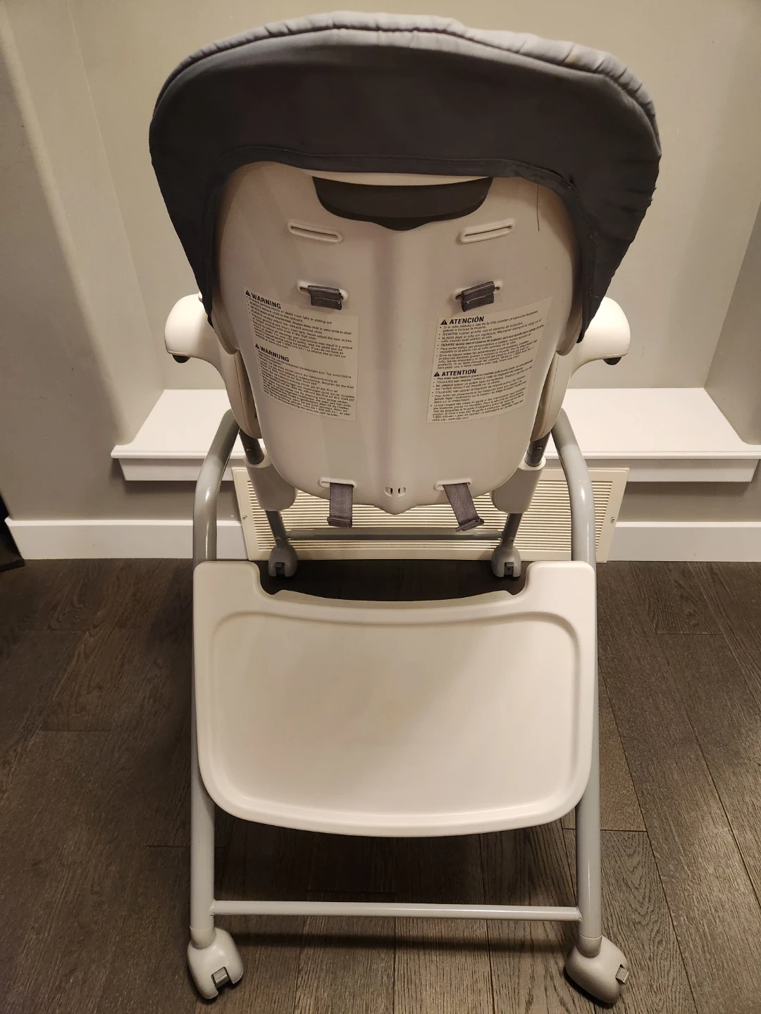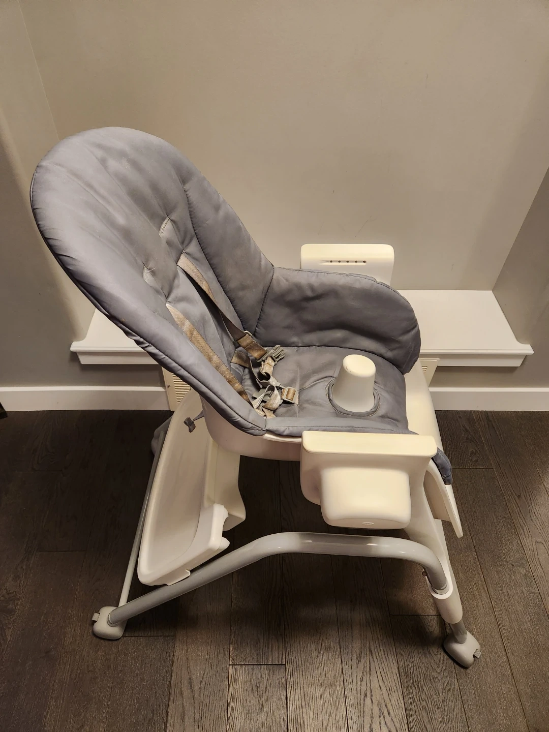 Used OXO High Chair. Restraints and wheel locks all work. Tray is removable and can be stored at the back of the high chair. Has a slight recline function as well.
