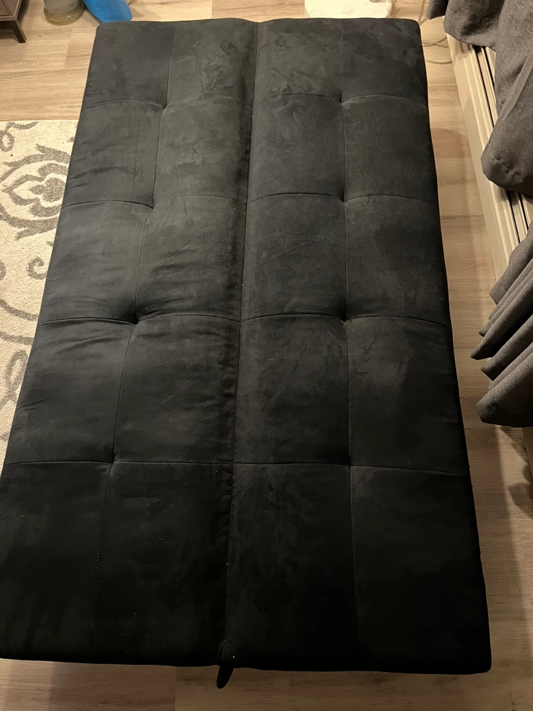 Simple black Futon, perfect for seating or a quick bed. Last pic shows a spring has come out at the bottom, price does reflect this.
