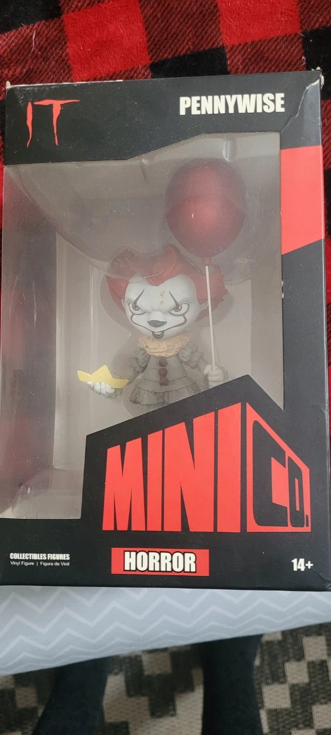 This is the Pennywise collectible figure from the IT movie. It's a vinyl figure with a red balloon and a paper boat. The recommended age is 14+.